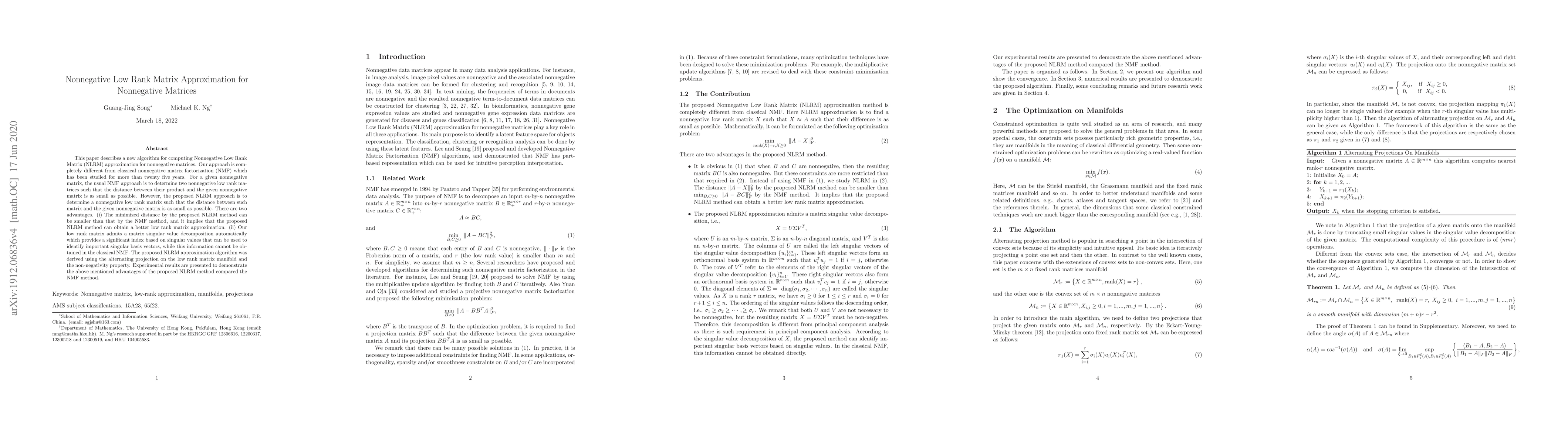 This paper describes a new algorithm for computing Nonnegative Low Rank Matrix (NLRM) approximation for nonnegative matrices. Our approach is completely different from classical nonnegative matrix factorization (NMF) which has been studied for more than twenty five years. For a given nonnegative matrix, the usual NMF approach is to determine two nonnegative low rank matrices such that the distance between their product and the given nonnegative matrix is as small as possible. However, the proposed NLRM approach is to determine a nonnegative low rank matrix such that the distance between such matrix and the given nonnegative matrix is as small as possible. There are two advantages. (i) The minimized distance by the proposed NLRM method can be smaller than that by the NMF method, and it implies that the proposed NLRM method can obtain a better low rank matrix approximation. (ii) Our low rank matrix admits a matrix singular value decomposition automatically which provides a significant index based on singular values that can be used to identify important singular basis vectors, while this information cannot be obtained in the classical NMF. The proposed NLRM approximation algorithm was derived using the alternating projection on the low rank matrix manifold and the non-negativity property. Experimental results are presented to demonstrate the above mentioned advantages of the proposed NLRM method compared the NMF method.