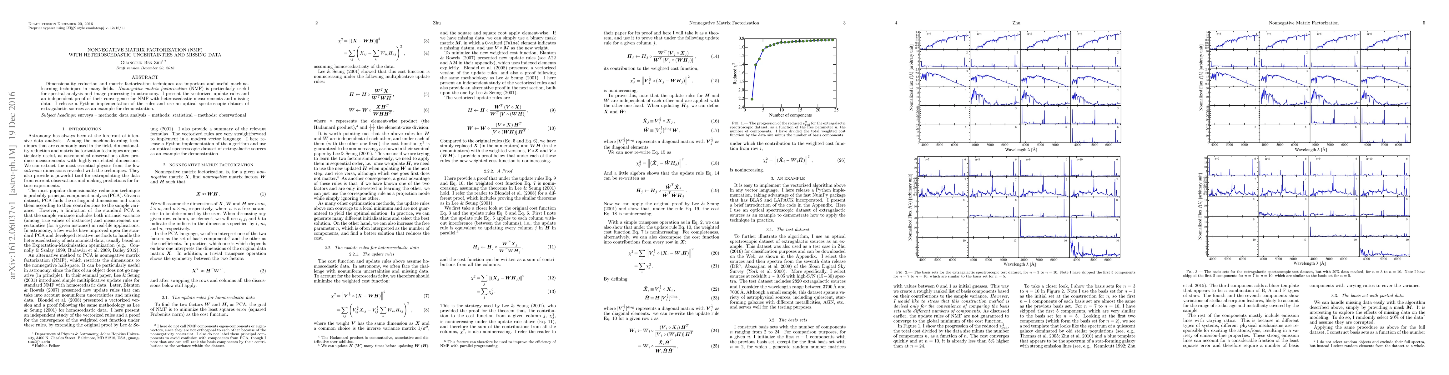 Dimensionality reduction and matrix factorization techniques are important and useful machine-learning techniques in many fields. Nonnegative matrix factorization (NMF) is particularly useful for spectral analysis and image processing in astronomy. I present the vectorized update rules and an independent proof of their convergence for NMF with heteroscedastic measurements and missing data. I release a Python implementation of the rules and use an optical spectroscopic dataset of extragalactic sources as an example for demonstration. A future paper will present results of applying the technique to image processing of planetary disks.
