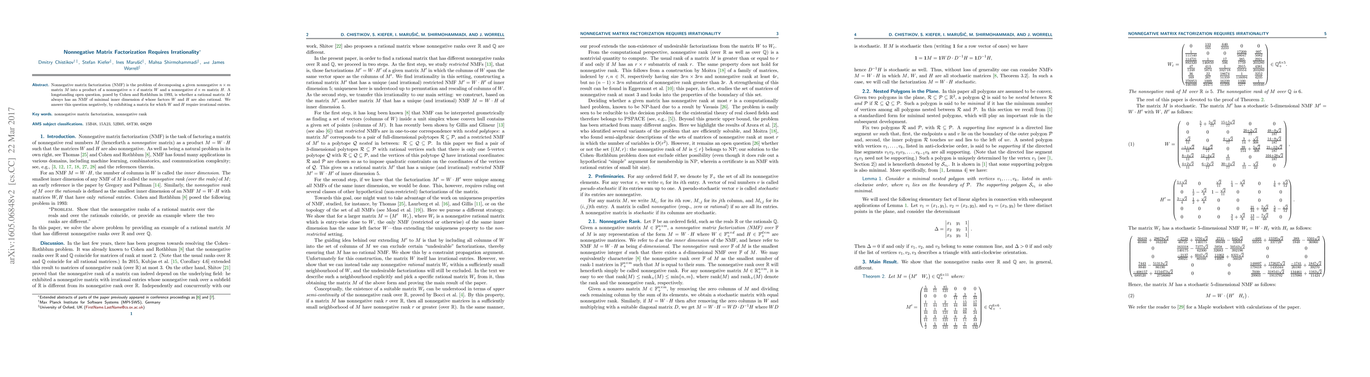 This paper demonstrates that nonnegative matrix factorization (NMF) cannot always be achieved with rational matrices, as it presents a specific case where the factors $W$ and $H$ must contain irrational entries, thus answering a longstanding question posed by Cohen and Rothblum in 1993.