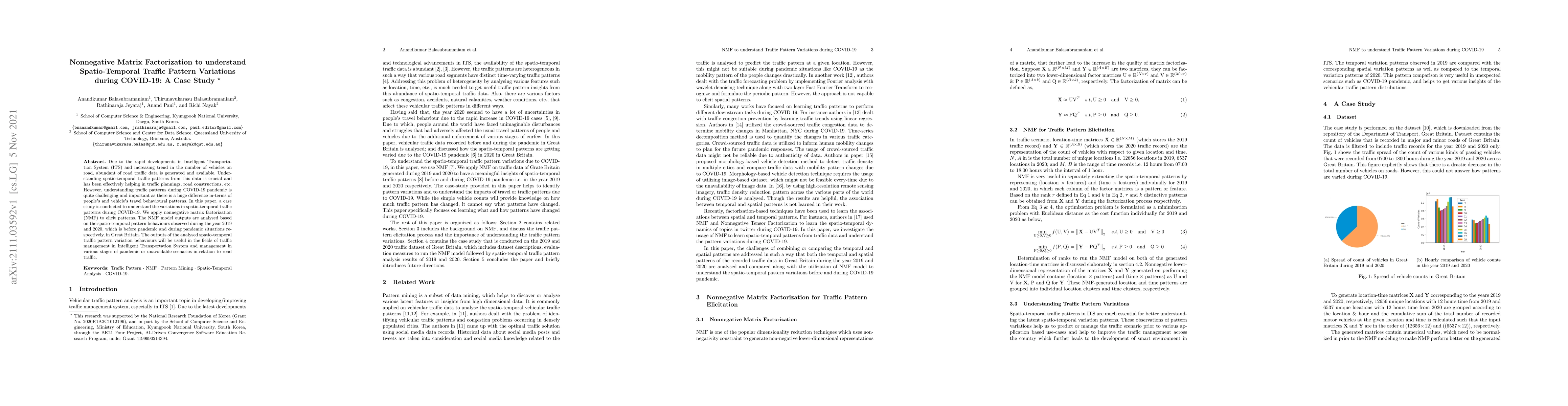 This paper applies nonnegative matrix factorization (NMF) to analyze spatio-temporal traffic pattern variations in Great Britain during COVID-19. The study compares traffic patterns from 2019 and 2020 to understand significant changes in travel behavior due to the pandemic, aiding traffic management and pandemic response planning.
