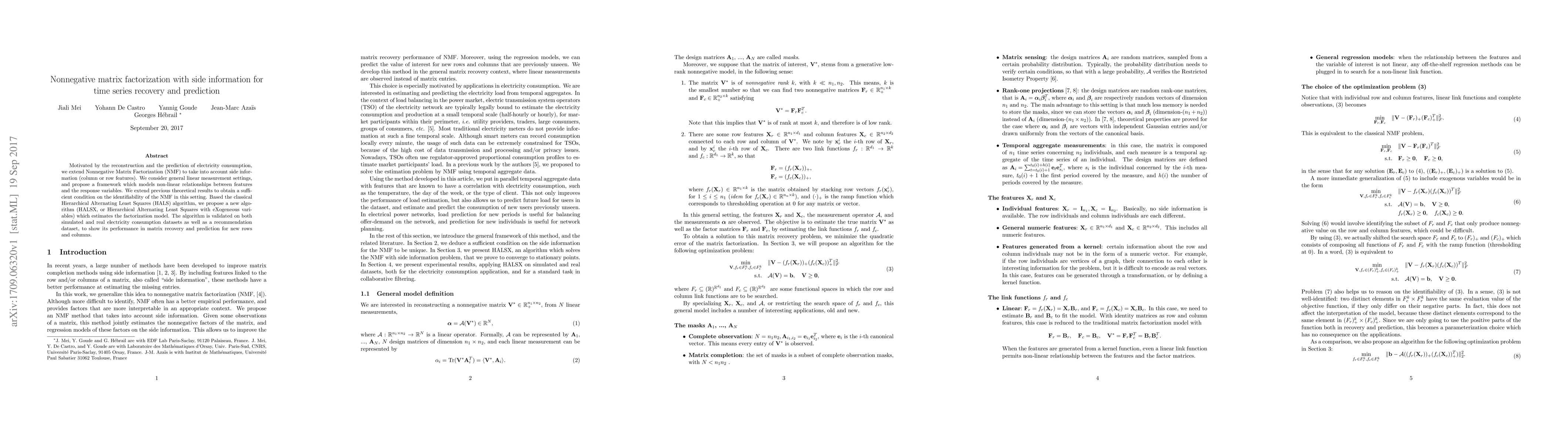 Motivated by the reconstruction and the prediction of electricity consumption, we extend Nonnegative Matrix Factorization~(NMF) to take into account side information (column or row features). We consider general linear measurement settings, and propose a framework which models non-linear relationships between features and the response variables. We extend previous theoretical results to obtain a sufficient condition on the identifiability of the NMF in this setting. Based the classical Hierarchical Alternating Least Squares~(HALS) algorithm, we propose a new algorithm (HALSX, or Hierarchical Alternating Least Squares with eXogeneous variables) which estimates the factorization model. The algorithm is validated on both simulated and real electricity consumption datasets as well as a recommendation dataset, to show its performance in matrix recovery and prediction for new rows and columns.