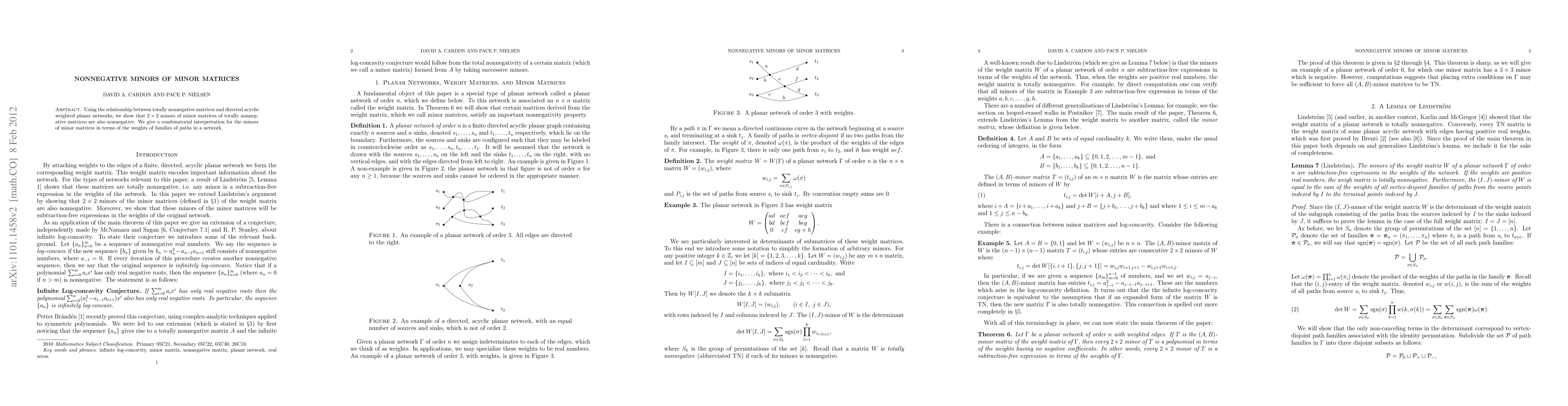 The paper establishes a connection between totally nonnegative matrices and directed acyclic weighted planar networks, demonstrating that $2 imes 2$ minors of minor matrices of totally nonnegative matrices are nonnegative. This is achieved through a combinatorial interpretation of minors in terms of path weights in a network.