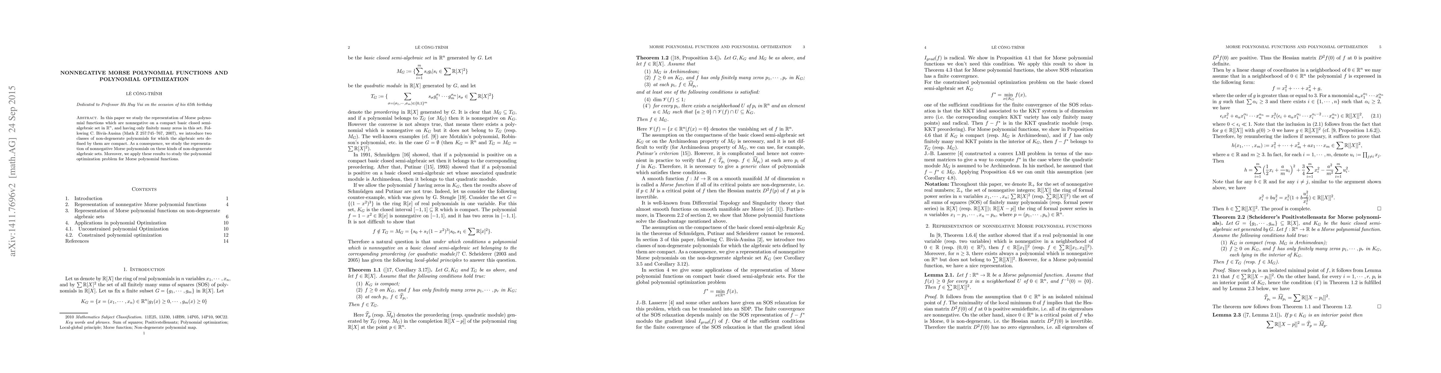 This paper studies nonnegative Morse polynomial functions on compact algebraic sets with finitely many zeros, developing new representation methods for optimization problems.