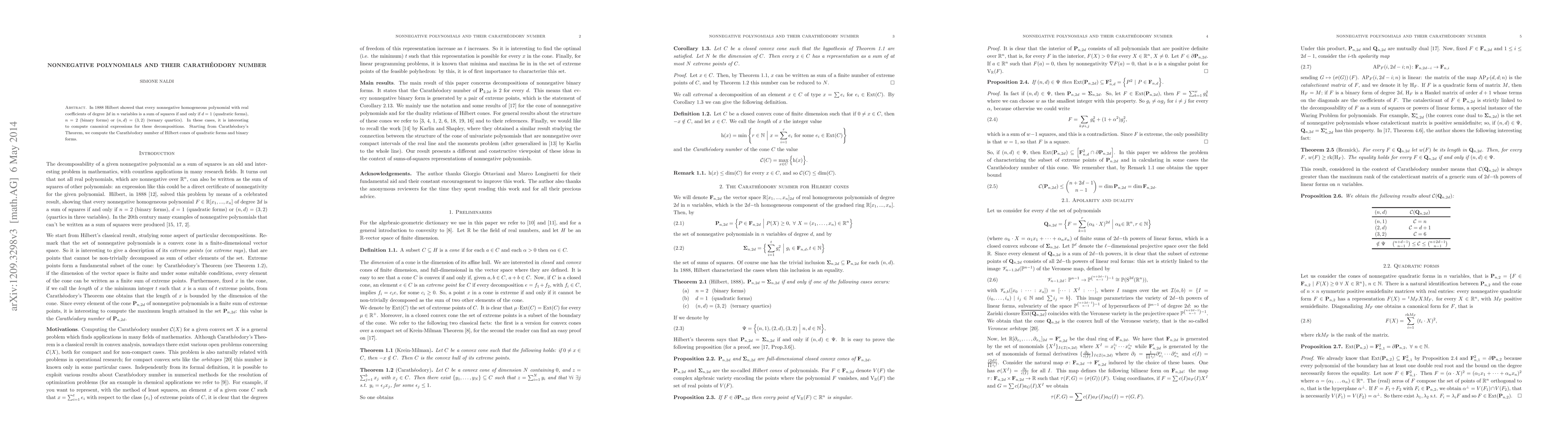 This paper discusses Hilbert's theorem on nonnegative homogeneous polynomials, focusing on their decomposition as sums of squares. It computes the Carathéodory number for the cones of nonnegative quadratic and binary forms, extending the understanding of these canonical expressions.