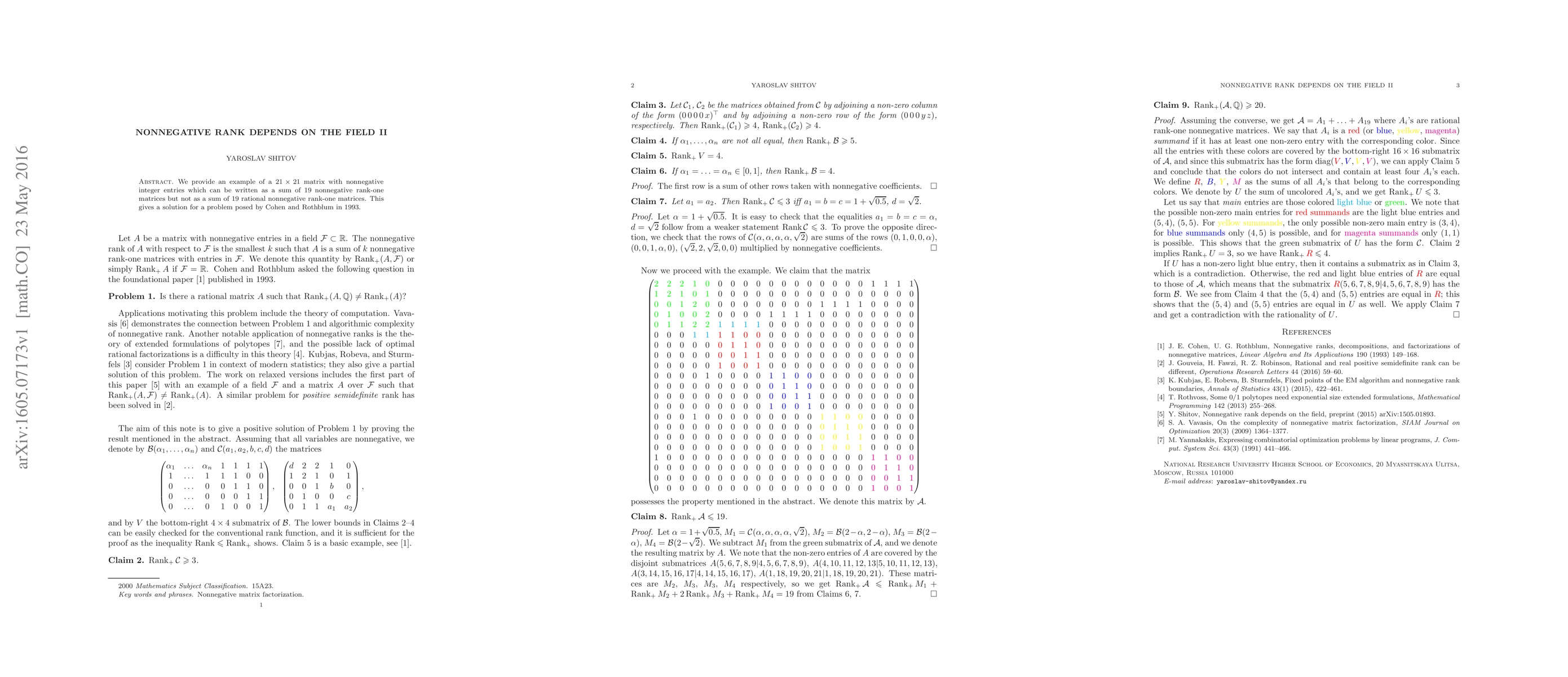 We provide an example of a $21\times 21$ matrix with nonnegative integer entries which can be written as a sum of $19$ nonnegative rank-one matrices but not as a sum of $19$ rational nonnegative rank-one matrices. This gives a solution for a problem posed by Cohen and Rothblum in 1993.