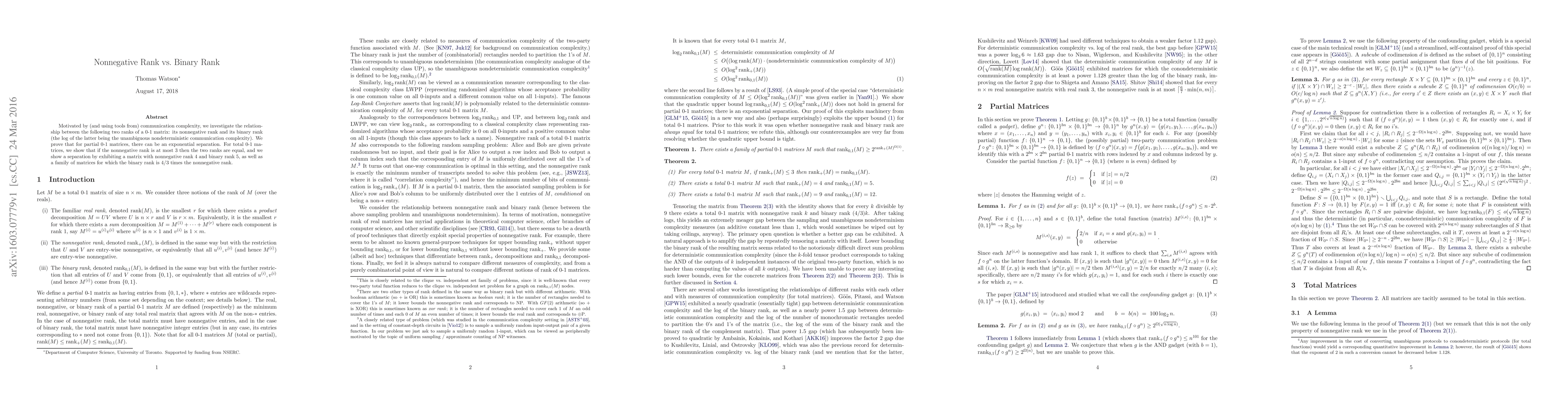 Motivated by (and using tools from) communication complexity, we investigate the relationship between the following two ranks of a $0$-$1$ matrix: its nonnegative rank and its binary rank (the $\log$ of the latter being the unambiguous nondeterministic communication complexity). We prove that for partial $0$-$1$ matrices, there can be an exponential separation. For total $0$-$1$ matrices, we show that if the nonnegative rank is at most $3$ then the two ranks are equal, and we show a separation by exhibiting a matrix with nonnegative rank $4$ and binary rank $5$, as well as a family of matrices for which the binary rank is $4/3$ times the nonnegative rank.