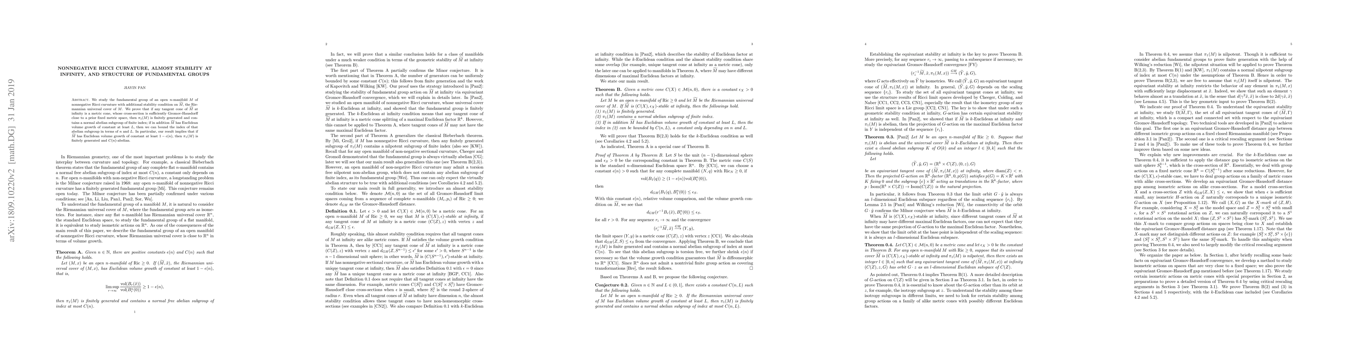 We study the fundamental group of an open $n$-manifold $M$ of nonnegative Ricci curvature with additional stability condition on $\widetilde{M}$, the Riemannian universal cover of $M$. We prove that if any tangent cone of $\widetilde{M}$ at infinity is a metric cone, whose cross-section is sufficiently Gromov-Hausdorff close to a prior fixed metric space, then $\pi_1(M)$ is finitely generated and contains a normal abelian subgroup of finite index; if in addition $\widetilde{M}$ has Euclidean volume growth of constant at least $L$, then we can bound the index of that abelian subgroup in terms of $n$ and $L$. In particular, our result implies that if $\widetilde{M}$ has Euclidean volume growth of constant at least $1-\epsilon(n)$, then $\pi_1(M)$ is finitely generated and $C(n)$-abelian.
