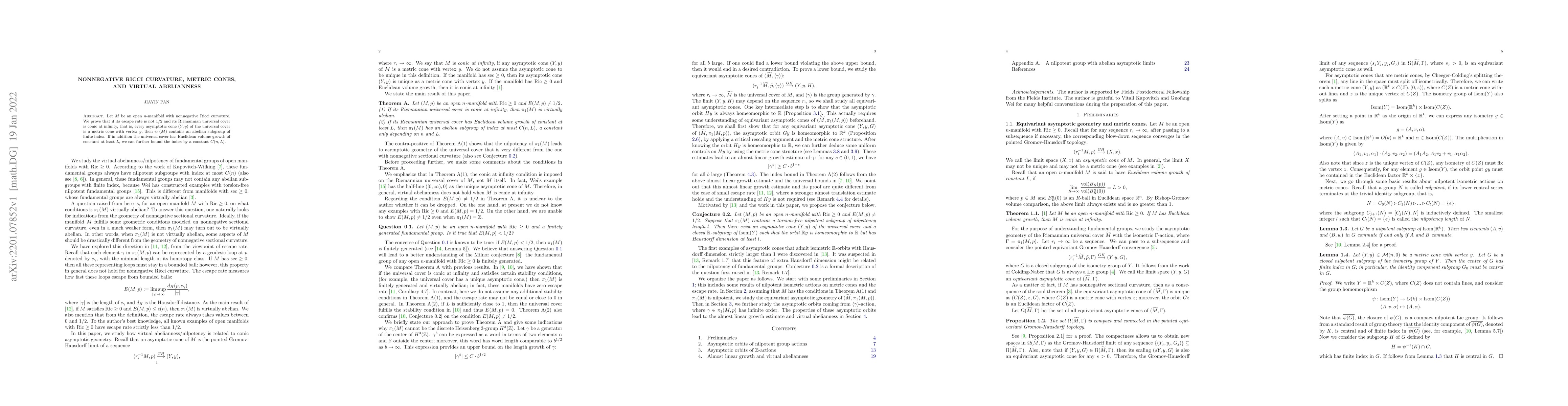 Summary: This paper proves that open manifolds with nonnegative Ricci curvature and specific conic asymptotic behavior of their universal covers possess a virtually abelian fundamental group, with the index of the abelian subgroup further bounded under conditions of Euclidean volume growth.
