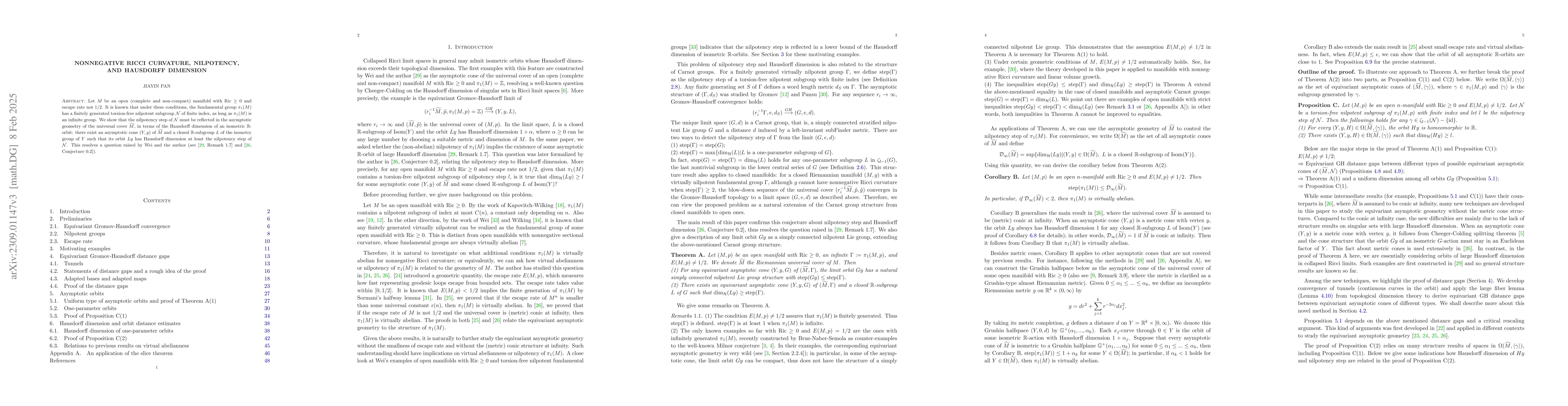 Let $M$ be an open (complete and non-compact) manifold with $\mathrm{Ric}\ge 0$ and escape rate not $1/2$. It is known that under these conditions, the fundamental group $\pi_1(M)$ has a finitely generated torsion-free nilpotent subgroup $\mathcal{N}$ of finite index, as long as $\pi_1(M)$ is an infinite group. We show that the nilpotency step of $\mathcal{N}$ must be reflected in the asymptotic geometry of the universal cover $\widetilde{M}$, in terms of the Hausdorff dimension of an isometric $\mathbb{R}$-orbit: there exist an asymptotic cone $(Y,y)$ of $\widetilde{M}$ and a closed $\mathbb{R}$-subgroup $L$ of the isometry group of $Y$ such that its orbit $Ly$ has Hausdorff dimension at least the nilpotency step of $\mathcal{N}$. This resolves a question raised by Wei and the author, and extends previous results on virtual abelianness by the author.