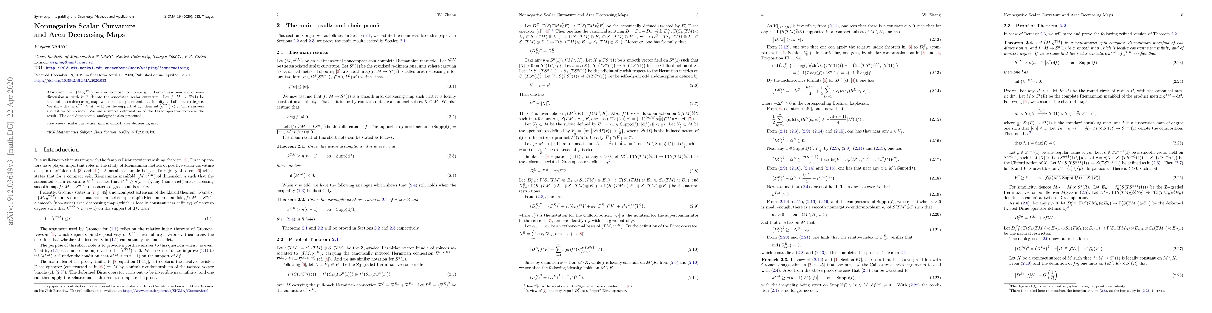 Let $\big(M,g^{TM}\big)$ be a noncompact complete spin Riemannian manifold of even dimension $n$, with $k^{TM}$ denote the associated scalar curvature. Let $f\colon M\rightarrow S^{n}(1)$ be a smooth area decreasing map, which is locally constant near infinity and of nonzero degree. We show that if $k^{TM}\geq n(n-1)$ on the support of ${\rm d}f$, then $ \inf \big(k^{TM}\big)< 0$. This answers a question of Gromov. We use a simple deformation of the Dirac operator to prove the result. The odd dimensional analogue is also presented.