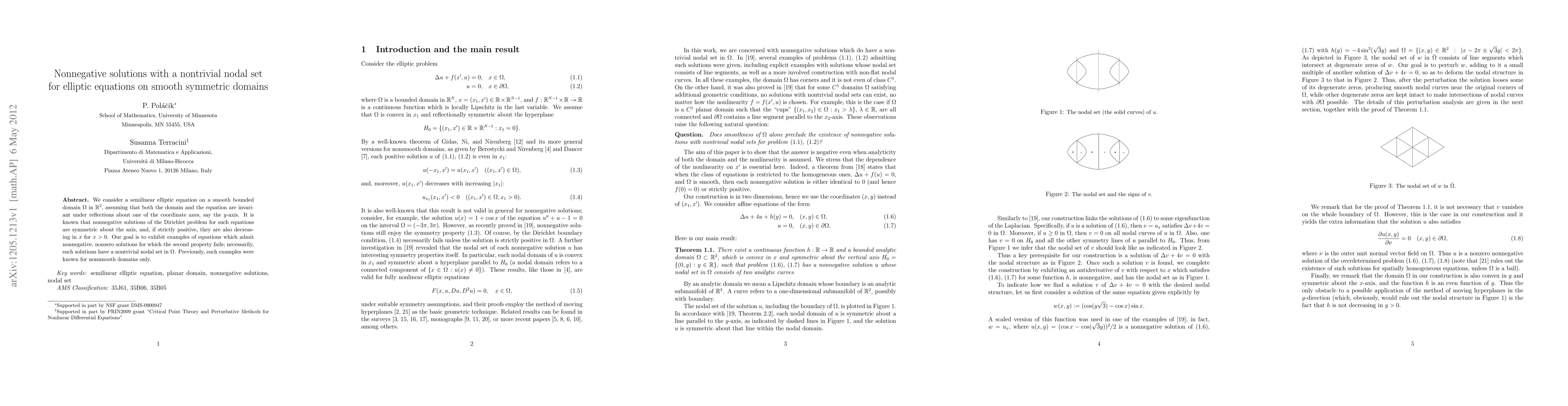 We consider a semilinear elliptic equation on a smooth bounded domain $\Om$ in $\R^2$, assuming that both the domain and the equation are invariant under reflections about one of the coordinate axes, say the y-axis. It is known that nonnegative solutions of the Dirichlet problem for such equations are symmetric about the axis, and, if strictly positive, they are also decreasing in $x$ for $x>0$. Our goal is to exhibit examples of equations which admit nonnegative, nonzero solutions for which the second property fails; necessarily, such solutions have a nontrivial nodal set in $\Om$. Previously, such examples were known for nonsmooth domains only.