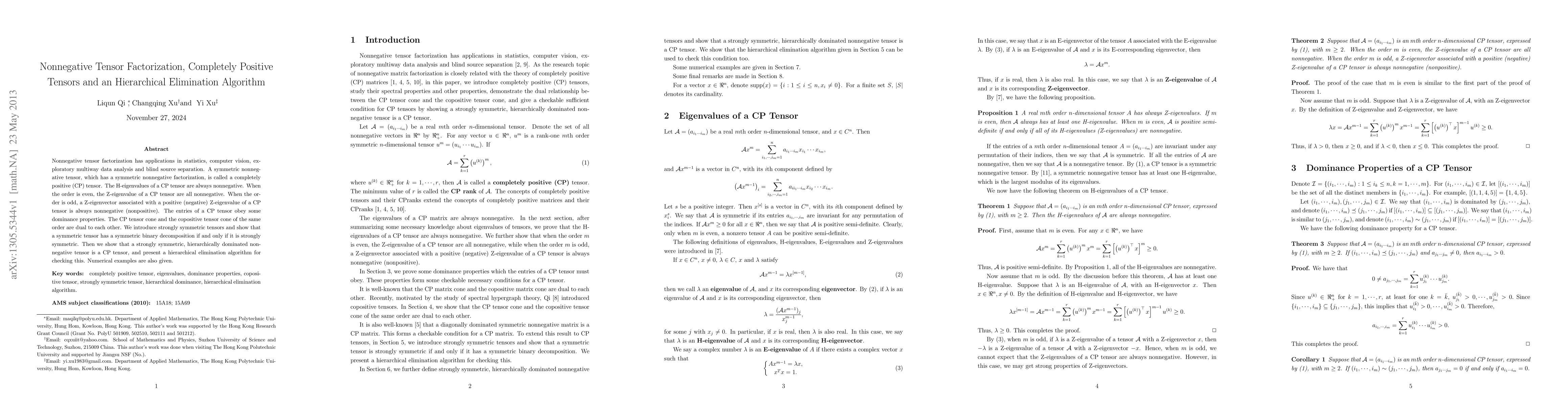 This paper explores nonnegative tensor factorization and introduces completely positive (CP) tensors, which have nonnegative H-eigenvalues and specific Z-eigenvalue properties based on tensor order. It presents a hierarchical elimination algorithm to verify if a tensor is CP and provides numerical examples to demonstrate its application.