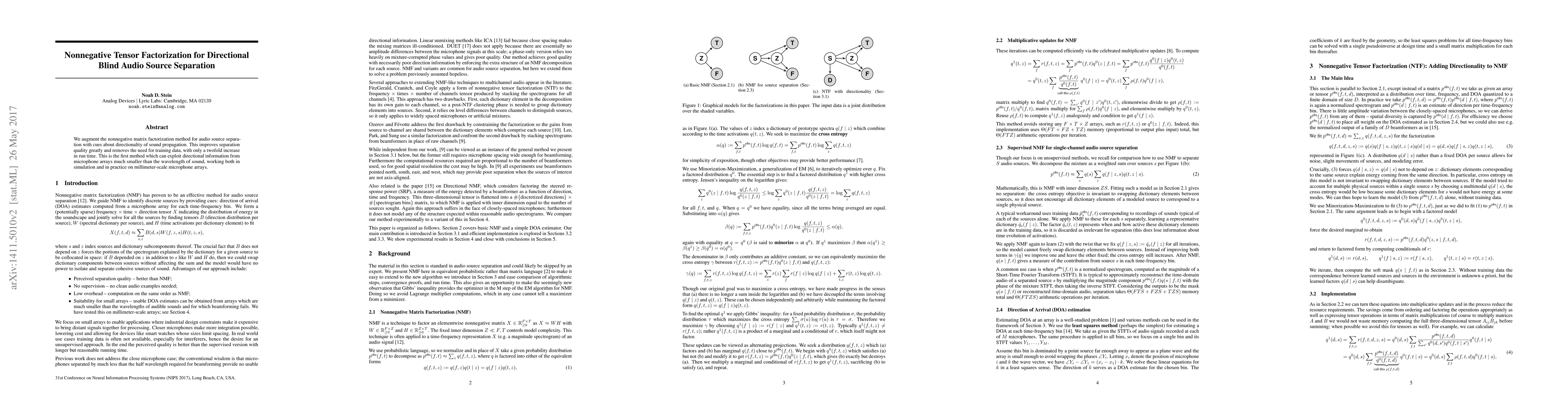 This paper introduces a nonnegative tensor factorization method for audio source separation that leverages directional sound cues, significantly improving separation quality without requiring training data. It effectively uses small microphone arrays, demonstrating practical success on millimeter-scale arrays.