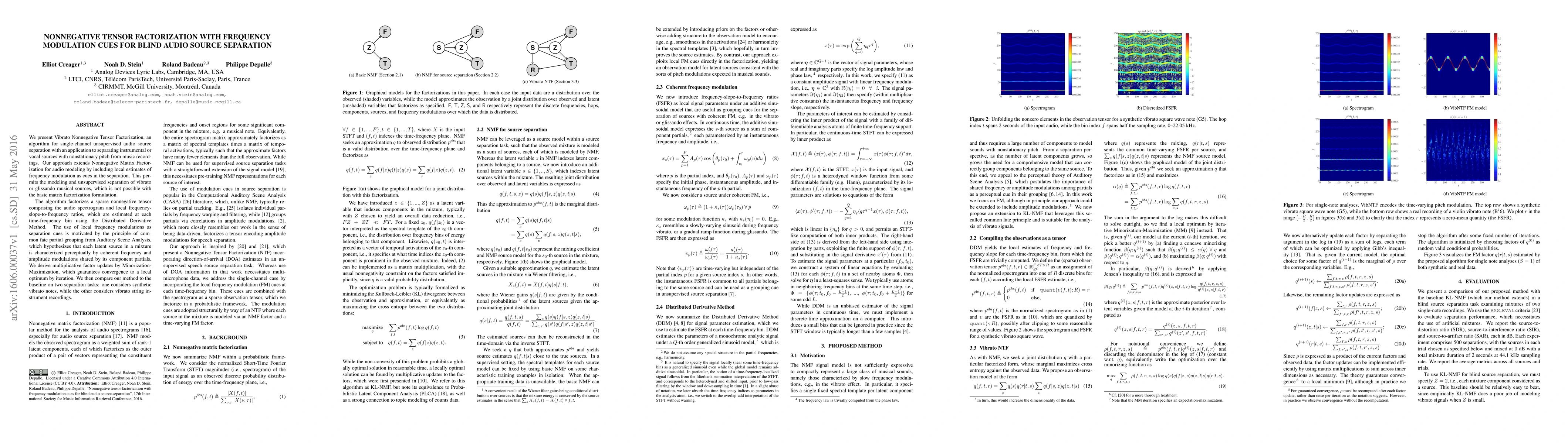 This paper introduces Vibrato Nonnegative Tensor Factorization, an algorithm for unsupervised separation of nonstationary pitch sources in music recordings by incorporating local frequency modulation cues. The method factorizes a tensor of audio spectrograms and frequency modulation ratios, achieving better separation of vibrato or glissando sources compared to basic matrix factorization.