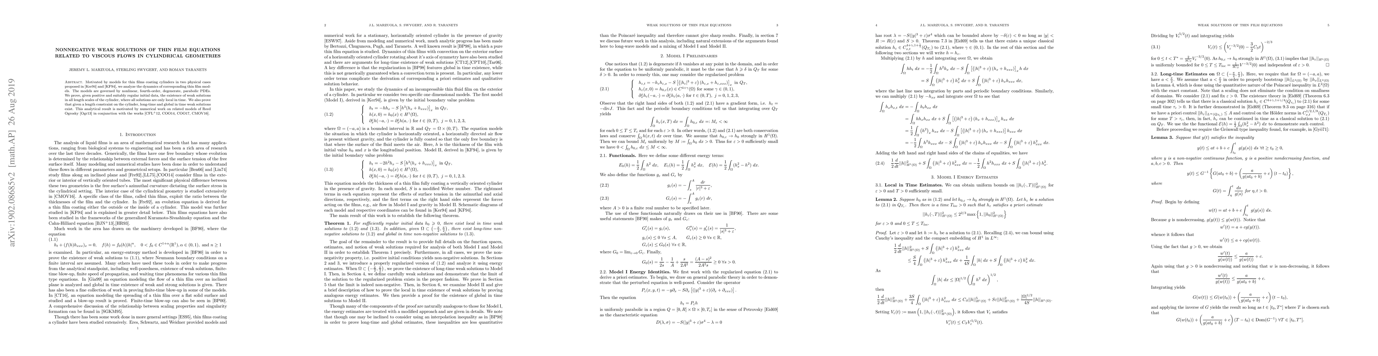 Researchers prove the existence of weak solutions to thin film models in cylindrical geometries with positive initial data, showing long-time and global stability under length constraints.