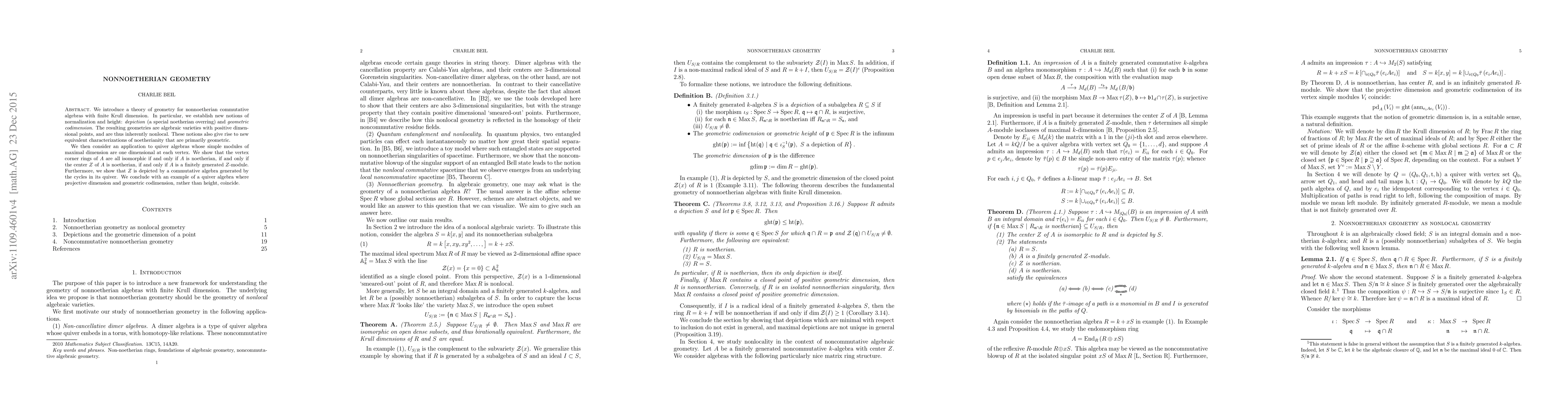 We introduce a theory of geometry for nonnoetherian commutative algebras with finite Krull dimension. In particular, we establish new notions of normalization and height: depiction (a special noetherian overring) and geometric codimension. The resulting geometries are algebraic varieties with positive dimensional points, and are thus inherently nonlocal. These notions also give rise to new equivalent characterizations of noetherianity that are primarily geometric. We then consider an application to quiver algebras whose simple modules of maximal dimension are one dimensional at each vertex. We show that the vertex corner rings of $A$ are all isomorphic if and only if $A$ is noetherian, if and only if the center $Z$ of $A$ is noetherian, if and only if $A$ is a finitely generated $Z$-module. Furthermore, we show that $Z$ is depicted by a commutative algebra generated by the cycles in its quiver. We conclude with an example of a quiver algebra where projective dimension and geometric codimension, rather than height, coincide.