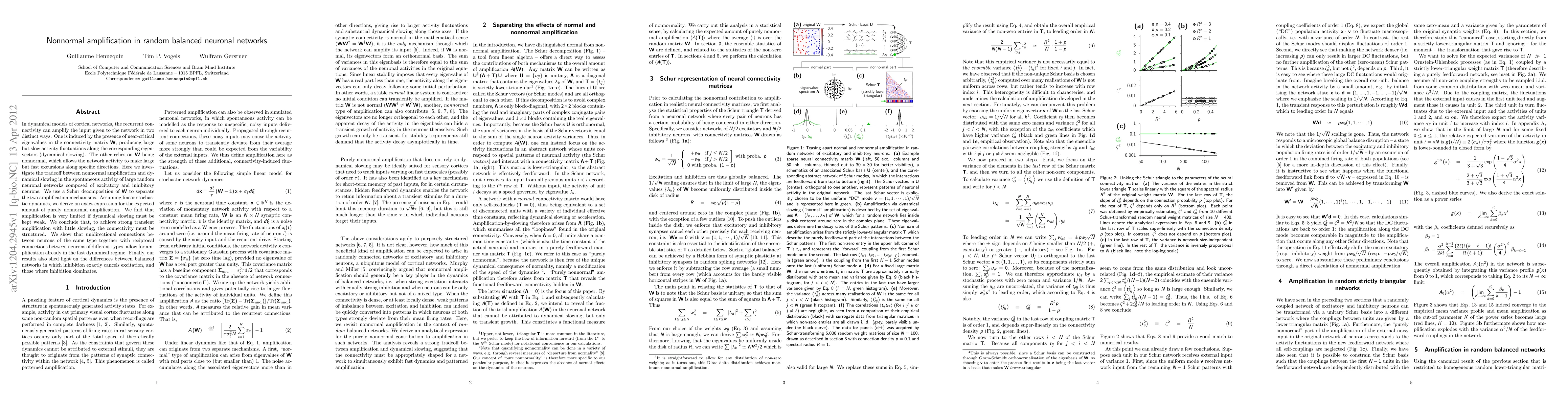 In dynamical models of cortical networks, the recurrent connectivity can amplify the input given to the network in two distinct ways. One is induced by the presence of near-critical eigenvalues in the connectivity matrix W, producing large but slow activity fluctuations along the corresponding eigenvectors (dynamical slowing). The other relies on W being nonnormal, which allows the network activity to make large but fast excursions along specific directions. Here we investigate the tradeoff between nonnormal amplification and dynamical slowing in the spontaneous activity of large random neuronal networks composed of excitatory and inhibitory neurons. We use a Schur decomposition of W to separate the two amplification mechanisms. Assuming linear stochastic dynamics, we derive an exact expression for the expected amount of purely nonnormal amplification. We find that amplification is very limited if dynamical slowing must be kept weak. We conclude that, to achieve strong transient amplification with little slowing, the connectivity must be structured. We show that unidirectional connections between neurons of the same type together with reciprocal connections between neurons of different types, allow for amplification already in the fast dynamical regime. Finally, our results also shed light on the differences between balanced networks in which inhibition exactly cancels excitation, and those where inhibition dominates.