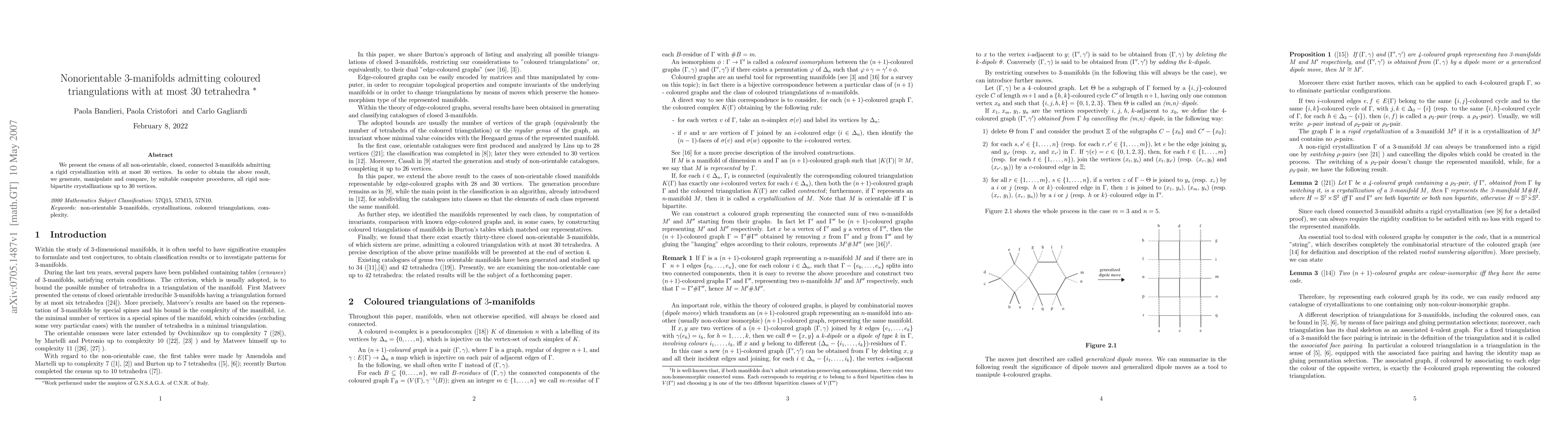 Summary: This paper conducts a comprehensive census of all closed, connected, non-orientable 3-manifolds that can be represented by coloured triangulations with no more than 30 vertices, achieved through systematic computational analysis of rigid non-bipartite crystallizations.
