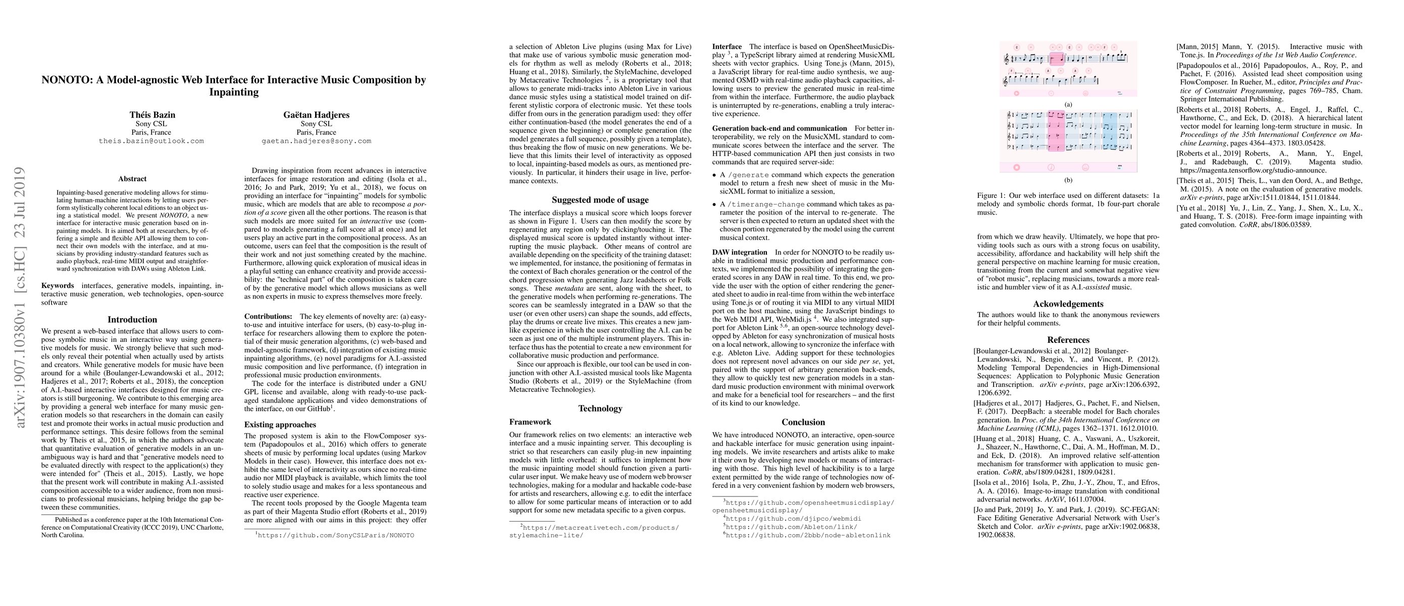 NONOTO is a model-agnostic web interface for interactive music composition using inpainting-based generative modeling, enabling users to make stylistically coherent edits. It caters to both researchers and musicians with a flexible API and industry-standard features like audio playback and MIDI output.