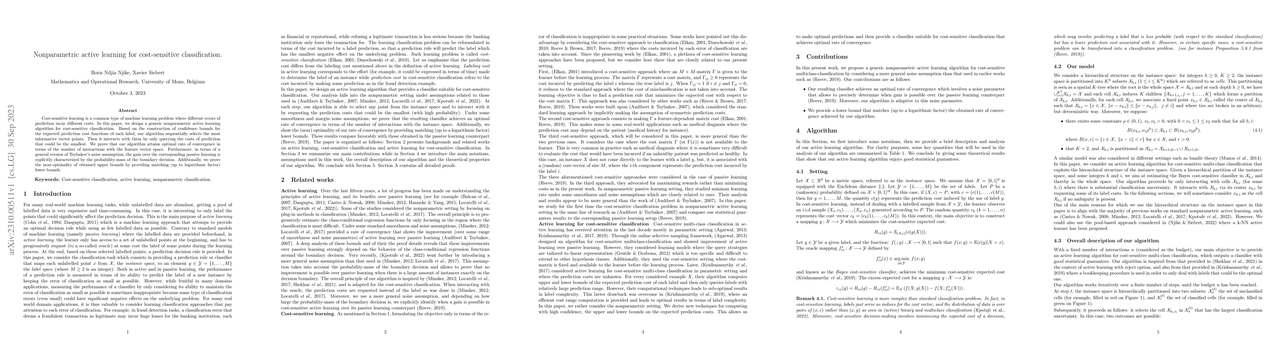 This paper proposes a nonparametric active learning algorithm for cost-sensitive classification, which selects the most informative data points based on confidence bounds for prediction costs. The algorithm achieves optimal convergence rates and demonstrates near-optimality in comparison to passive learning, with a gain characterized by the boundary decision's probability-mass.