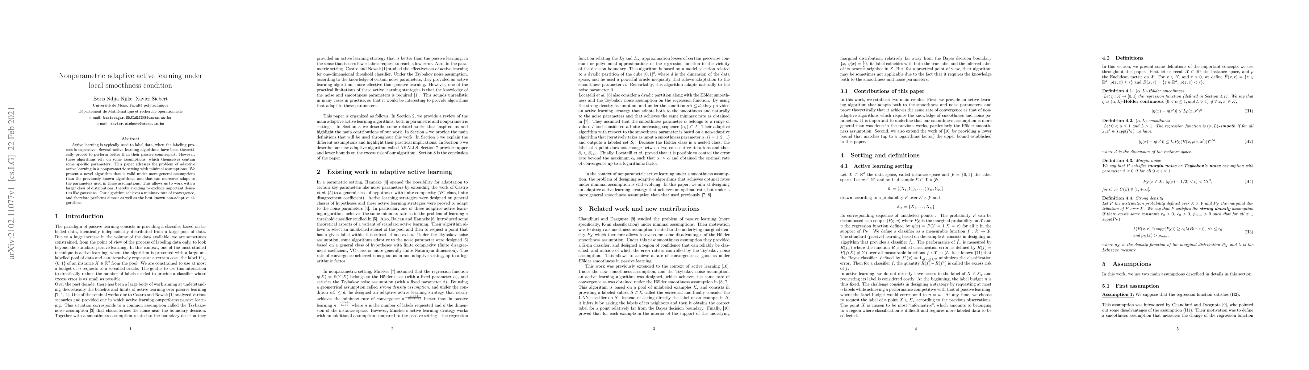 This paper introduces a novel nonparametric adaptive active learning algorithm that operates under minimal assumptions and can adapt to specific parameters, allowing it to handle a broader range of distributions, including Gaussians. The algorithm achieves a minimax rate of convergence, performing nearly as well as the best non-adaptive algorithms.