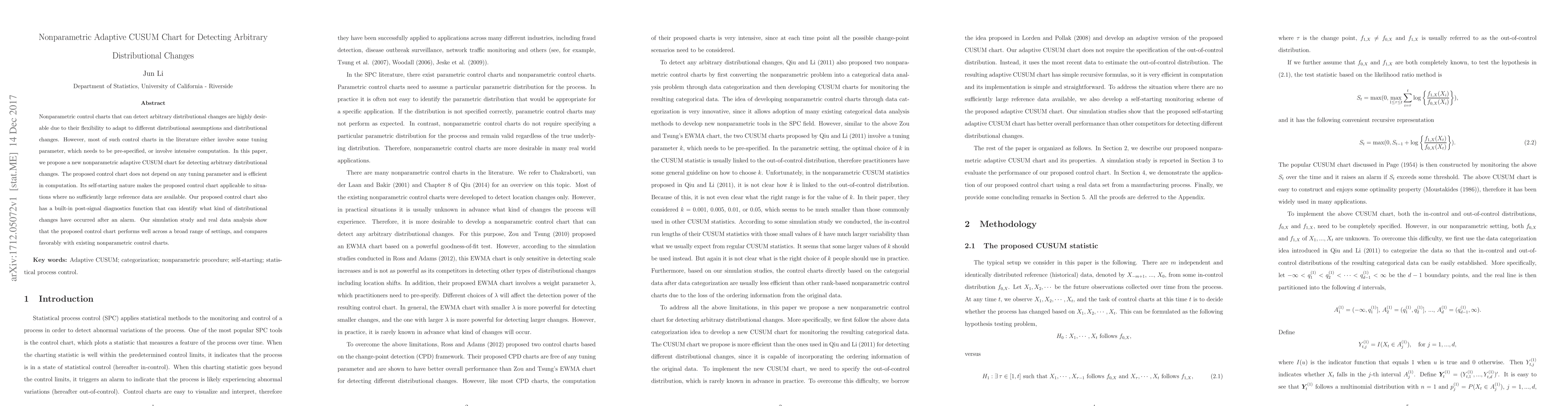 This paper introduces a new nonparametric adaptive CUSUM chart for detecting arbitrary distributional changes without requiring tuning parameters or intensive computation. The proposed method includes a self-starting feature and a diagnostic function to identify distributional shifts, performing well across various settings.