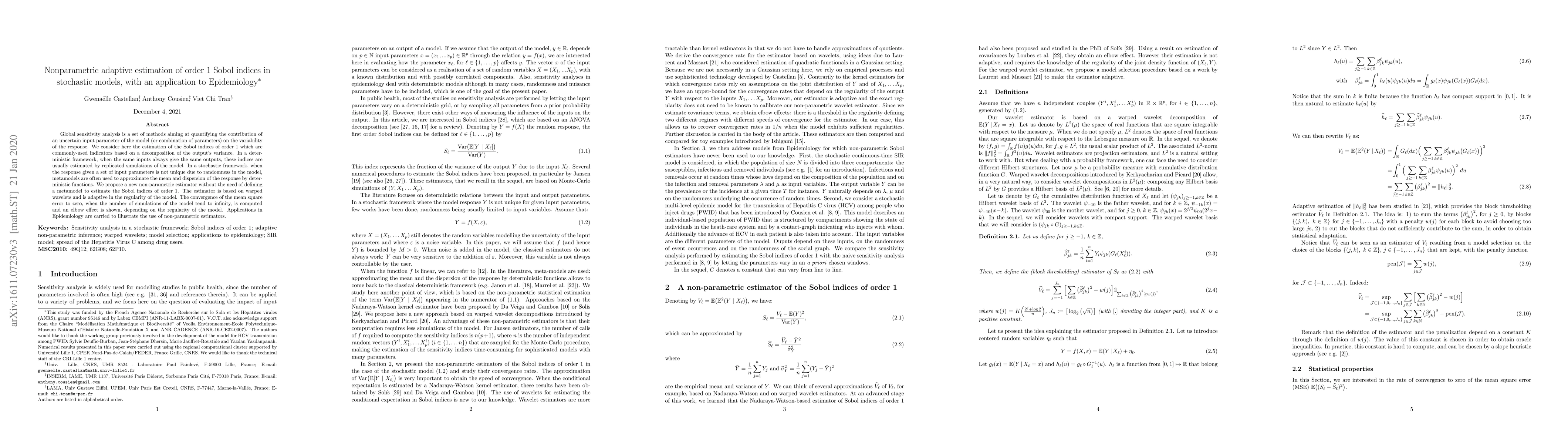 Global sensitivity analysis is a set of methods aiming at quantifying the contribution of an uncertain input parameter of the model (or combination of parameters) on the variability of the response. We consider here the estimation of the Sobol indices of order 1 which are commonly-used indicators based on a decomposition of the output's variance. In a deterministic framework, when the same inputs always give the same outputs, these indices are usually estimated by replicated simulations of the model. In a stochastic framework, when the response given a set of input parameters is not unique due to randomness in the model, metamodels are often used to approximate the mean and dispersion of the response by deterministic functions. We propose a new non-parametric estimator without the need of defining a metamodel to estimate the Sobol indices of order 1. The estimator is based on warped wavelets and is adaptive in the regularity of the model. The convergence of the mean square error to zero, when the number of simulations of the model tend to infinity, is computed and an elbow effect is shown, depending on the regularity of the model. Applications in Epidemiology are carried to illustrate the use of non-parametric estimators.
