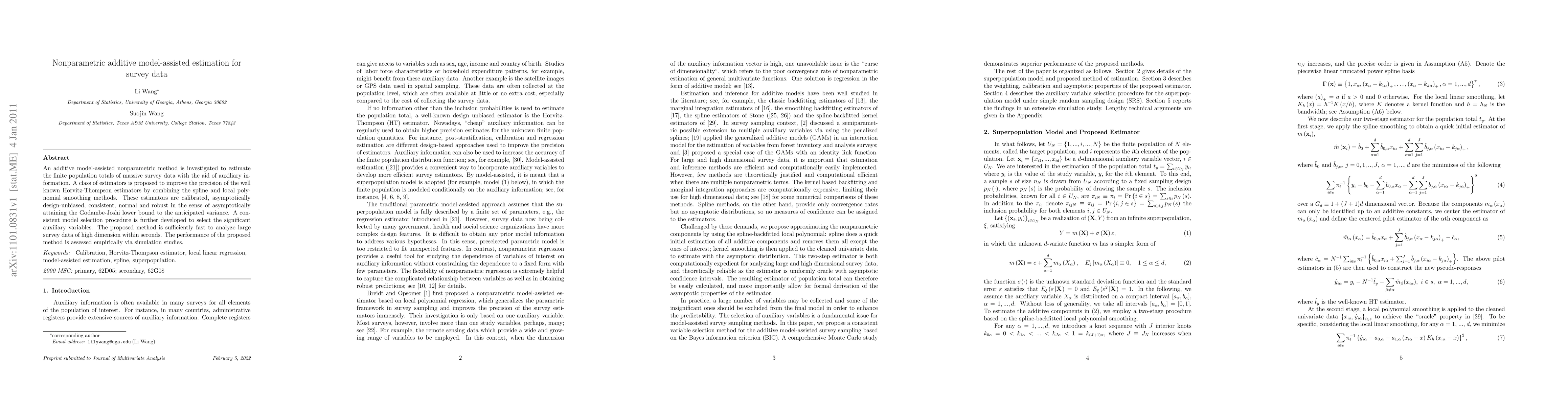 This paper proposes a nonparametric additive model-assisted method for estimating finite population totals in large survey data using auxiliary information. The method combines spline and local polynomial smoothing to enhance Horvitz-Thompson estimators, demonstrating improved precision, consistency, and robustness.