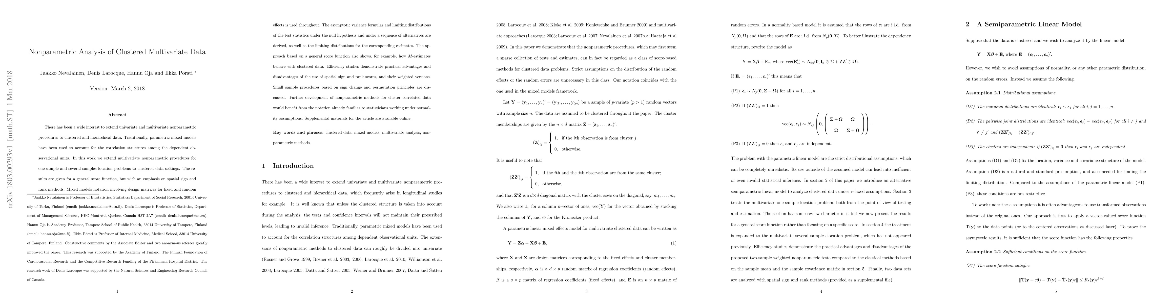 This paper extends multivariate nonparametric procedures to clustered data settings, focusing on spatial sign and rank methods for one-sample and several samples location problems. It derives asymptotic variance formulas and limiting distributions for test statistics and estimates, and discusses efficiency and small sample procedures.
