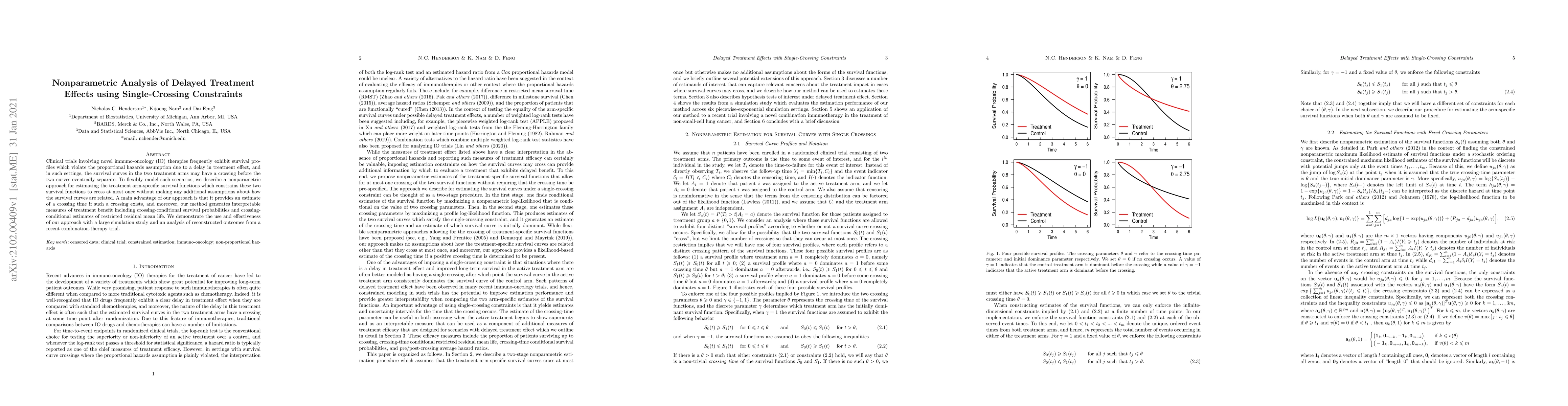 Clinical trials involving novel immuno-oncology (IO) therapies frequently exhibit survival profiles which violate the proportional hazards assumption due to a delay in treatment effect, and in such settings, the survival curves in the two treatment arms may have a crossing before the two curves eventually separate. To flexibly model such scenarios, we describe a nonparametric approach for estimating the treatment arm-specific survival functions which constrains these two survival functions to cross at most once without making any additional assumptions about how the survival curves are related. A main advantage of our approach is that it provides an estimate of a crossing time if such a crossing exists, and moreover, our method generates interpretable measures of treatment benefit including crossing-conditional survival probabilities and crossing-conditional estimates of restricted residual mean life. We demonstrate the use and effectiveness of our approach with a large simulation study and an analysis of reconstructed outcomes from a recent combination-therapy trial.