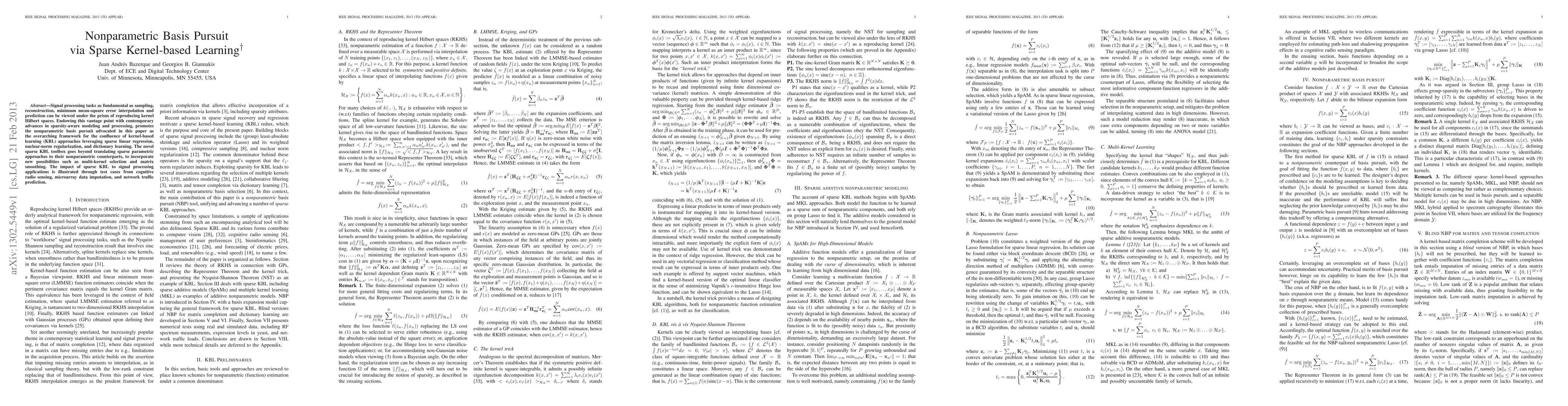This paper proposes a nonparametric basis pursuit framework using sparse kernel-based learning, integrating sparse linear regression, nuclear-norm regularization, and dictionary learning. It demonstrates the application through cognitive radio sensing, microarray data imputation, and network traffic prediction.