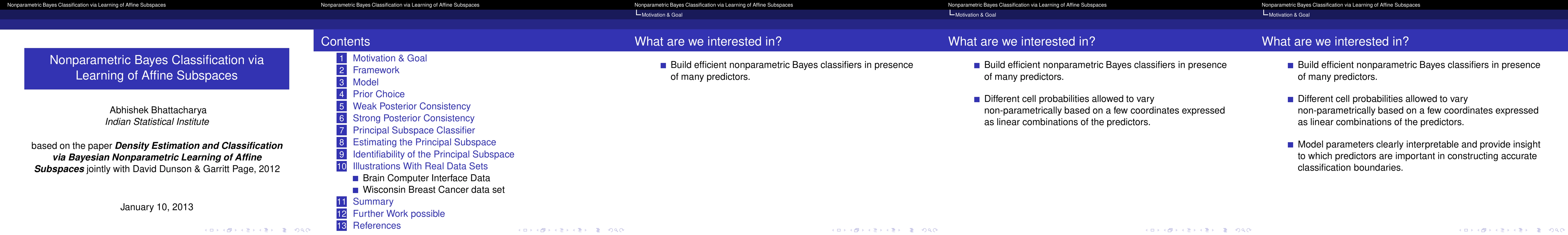 The goal of this presentation is to build an efficient non-parametric Bayes classifier in the presence of large numbers of predictors. When analyzing such data, parametric models are often too inflexible while non-parametric procedures tend to be non-robust because of insufficient data on these high dimensional spaces. When dealing with these types of data, it is often the case that most of the variability tends to lie along a few directions, or more generally along a much smaller dimensional subspace of the feature space. Hence a class of regression models is proposed that flexibly learn about this subspace while simultaneously performing dimension reduction in classification. This methodology, allows the cell probabilities to vary non-parametrically based on a few coordinates expressed as linear combinations of the predictors. Also, as opposed to many black-box methods for dimensionality reduction, the proposed model is appealing in having clearly interpretable and identifiable parameters which provide insight into which predictors are important in determining accurate classification boundaries. Gibbs sampling methods are developed for posterior computations. The estimated cell probabilities are theoretically shown to be consistent, and real data applications are included to support the findings.
