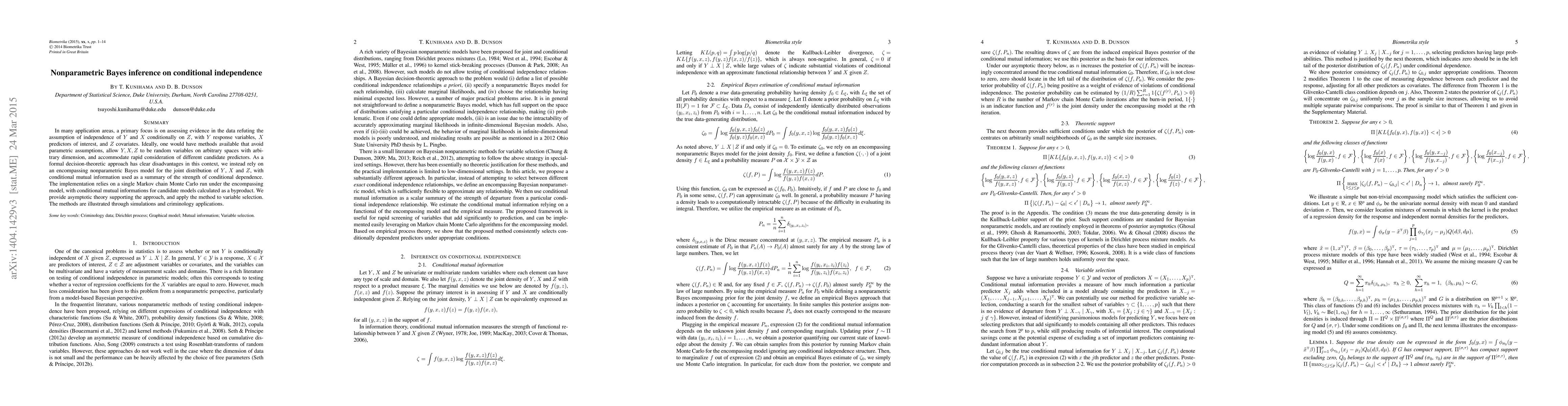 This paper proposes a nonparametric Bayesian approach to test conditional independence in data, using conditional mutual information to measure the strength of relationships. The method accommodates mixed measurement scales and is applied to variable selection and criminology, with consistent hypothesis selection ensured under certain conditions.
