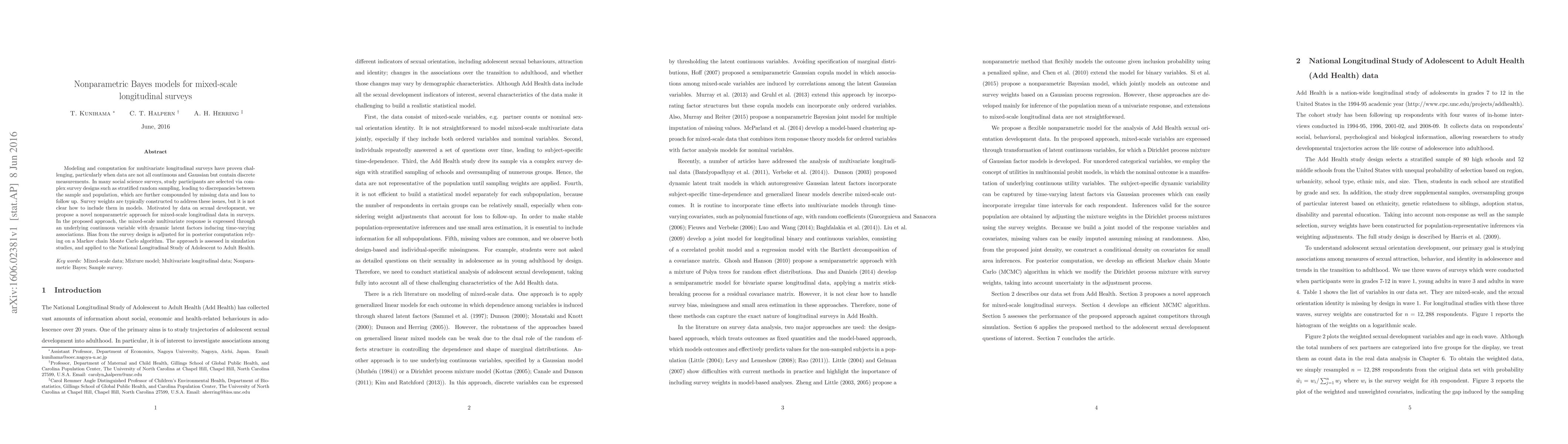 This paper proposes a nonparametric Bayesian model for mixed-scale longitudinal survey data, addressing challenges from discrete measurements and complex survey designs. The model uses dynamic latent factors to capture time-varying associations and adjusts for survey design bias via Markov chain Monte Carlo, demonstrated through simulations and an application to the National Longitudinal Study of Adolescent to Adult Health.