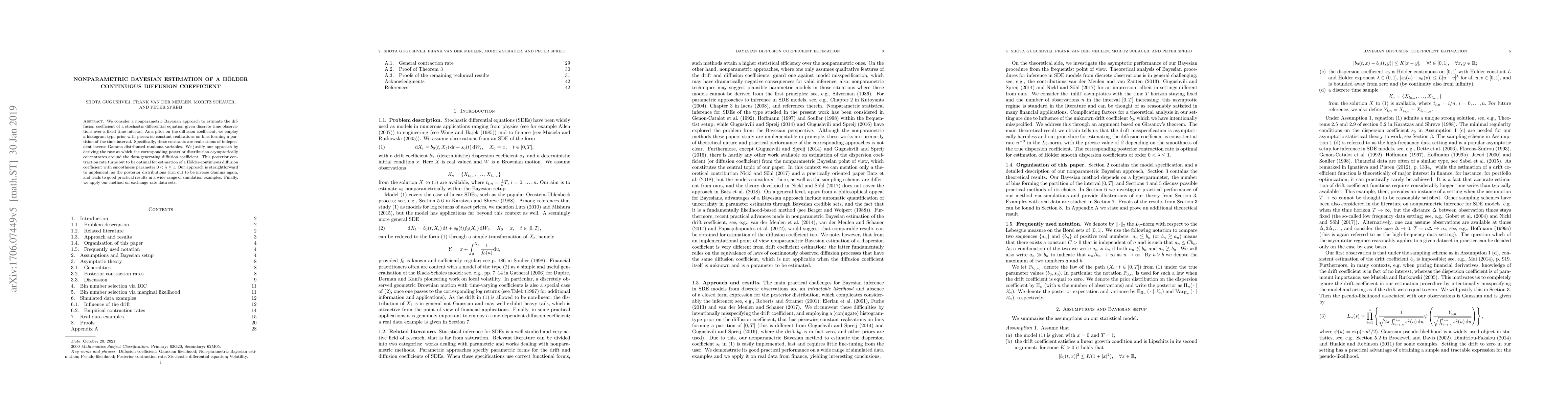 This paper proposes a nonparametric Bayesian method for estimating the diffusion coefficient of a stochastic differential equation using discrete time observations. It employs a histogram-type prior and demonstrates optimal posterior contraction rate for H\"older-continuous coefficients, with practical implementation facilitated by inverse Gamma posterior distributions.