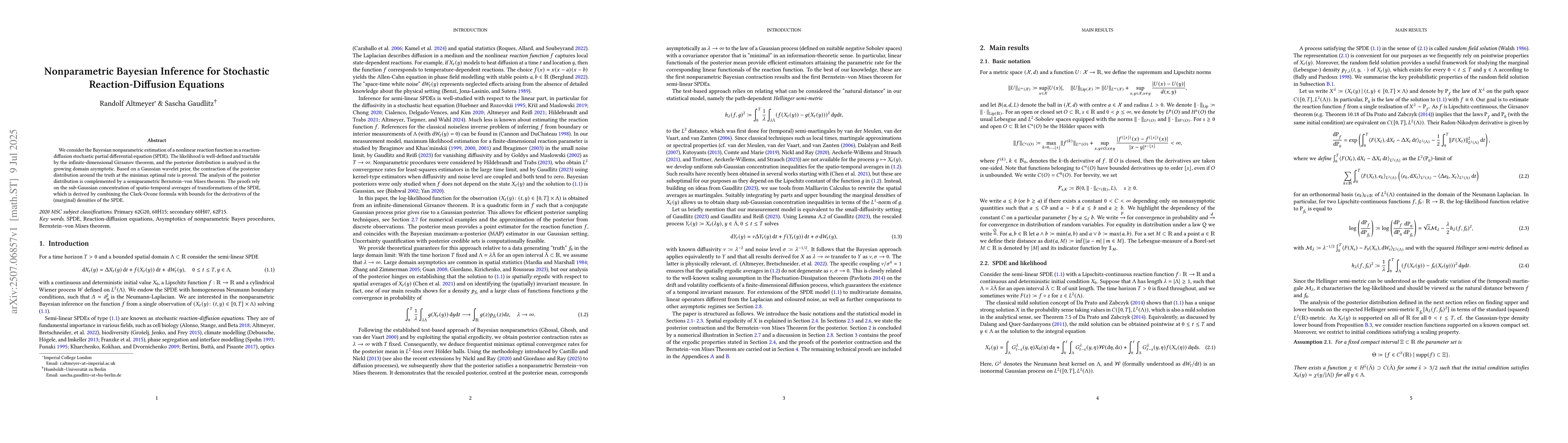 We consider the Bayesian nonparametric estimation of a nonlinear reaction function in a reaction-diffusion stochastic partial differential equation (SPDE). The likelihood is well-defined and tractable by the infinite-dimensional Girsanov theorem, and the posterior distribution is analysed in the growing domain asymptotic. Based on a Gaussian wavelet prior, the contraction of the posterior distribution around the truth at the minimax optimal rate is proved. The analysis of the posterior distribution is complemented by a semiparametric Bernstein--von Mises theorem. The proofs rely on the sub-Gaussian concentration of spatio-temporal averages of transformations of the SPDE, which is derived by combining the Clark-Ocone formula with bounds for the derivatives of the (marginal) densities of the SPDE.