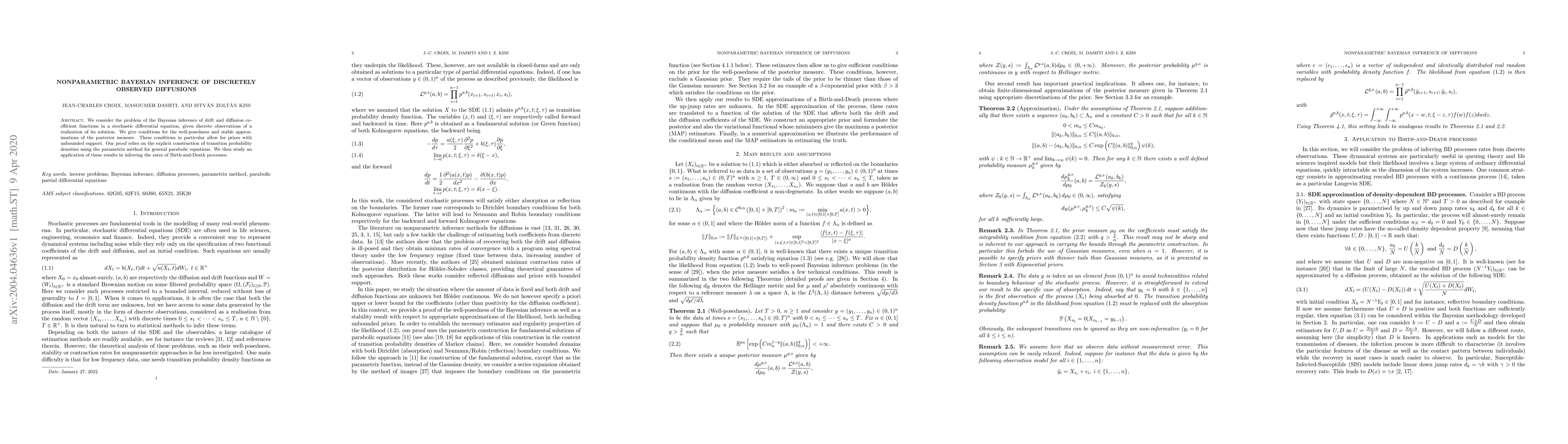 This paper develops nonparametric Bayesian inference methods for estimating drift and diffusion functions in stochastic differential equations from discrete observations. It establishes conditions for the well-posedness and stable approximation of the posterior measure, allowing for priors with unbounded support, and applies these methods to infer the rates of Birth-and-Death processes.