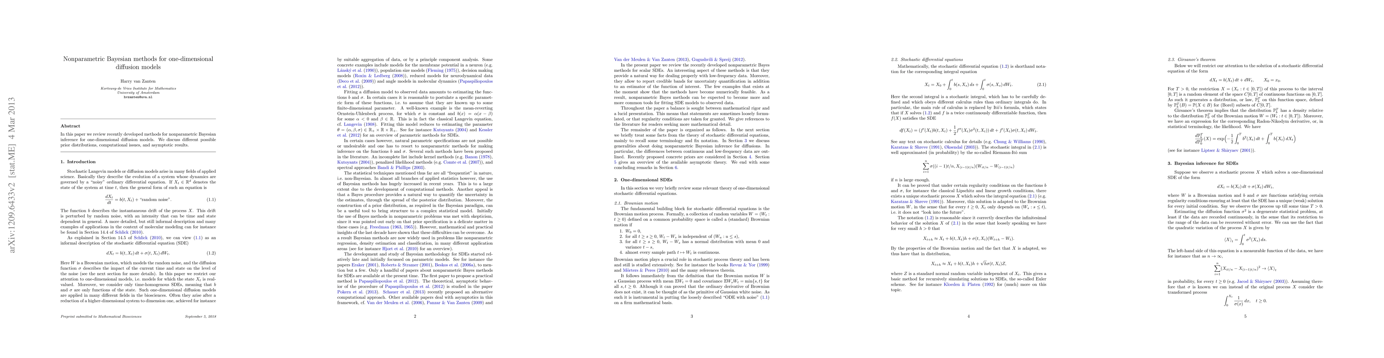 This paper reviews nonparametric Bayesian methods for one-dimensional diffusion models, discussing prior distributions, computational issues, and asymptotic results.