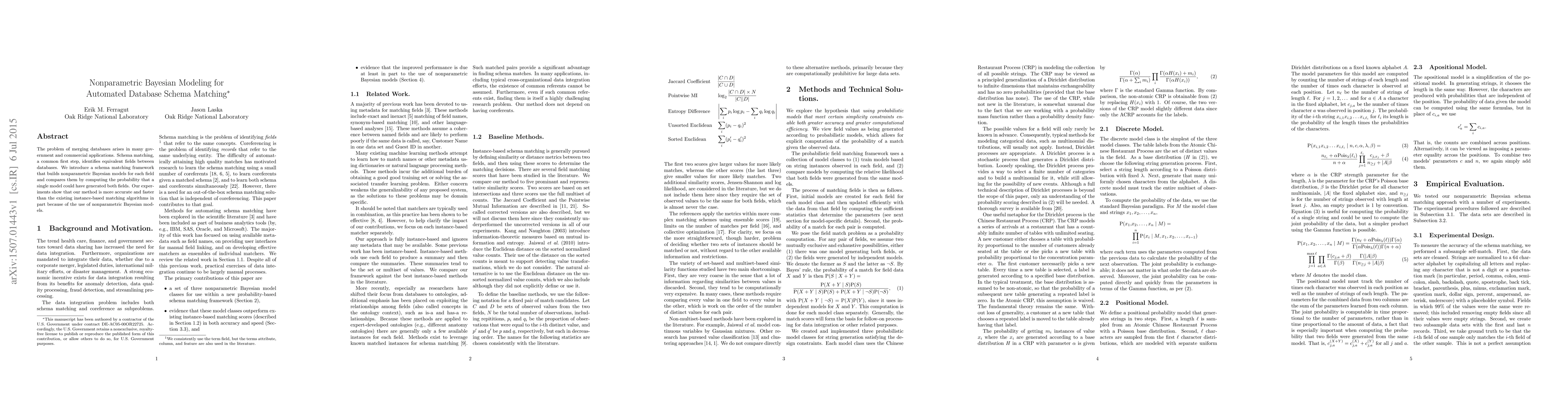 This paper proposes a nonparametric Bayesian modeling framework for automated database schema matching, demonstrating improved accuracy and speed over existing instance-based methods by comparing the probability that a single model could generate equivalent fields.