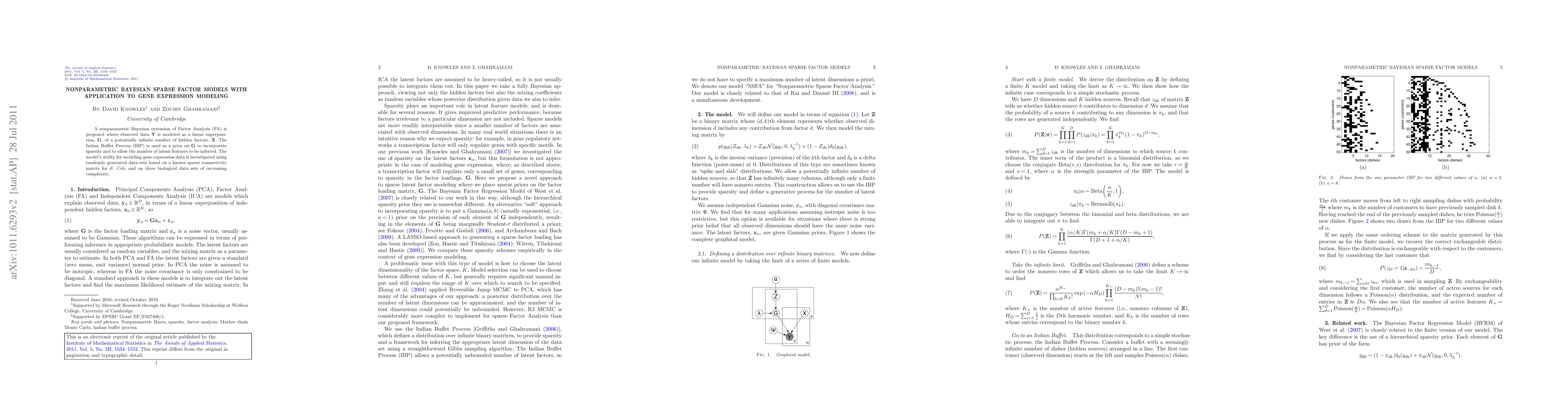 This paper proposes a nonparametric Bayesian sparse factor model using the Indian Buffet Process to infer an optimal number of latent features, demonstrating its application in modeling gene expression data through simulations and real biological datasets. The model effectively captures sparse connectivity in gene expression data.