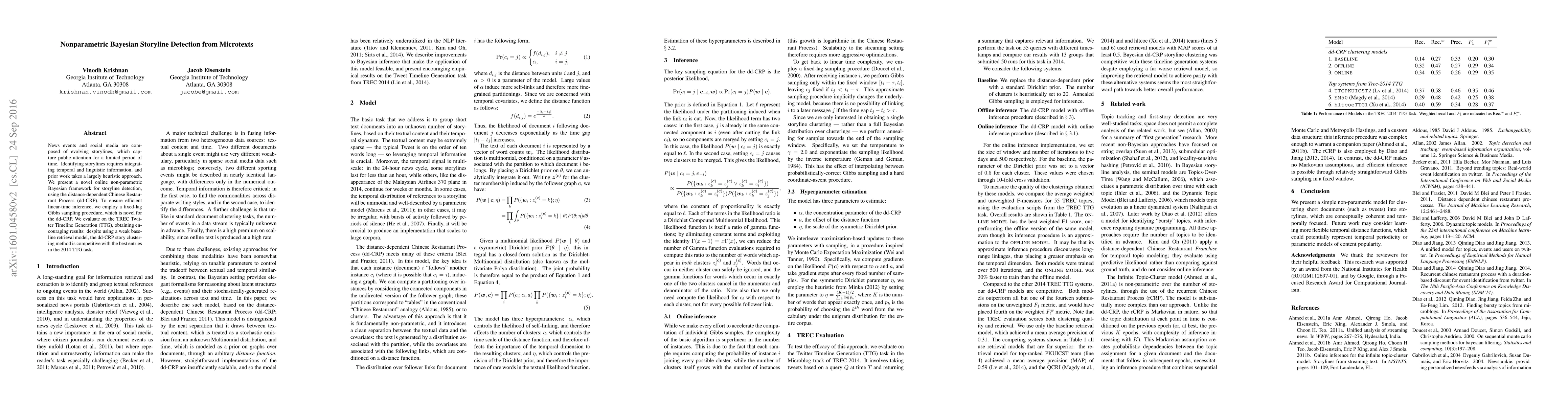 News events and social media are composed of evolving storylines, which capture public attention for a limited period of time. Identifying storylines requires integrating temporal and linguistic information, and prior work takes a largely heuristic approach. We present a novel online non-parametric Bayesian framework for storyline detection, using the distance-dependent Chinese Restaurant Process (dd-CRP). To ensure efficient linear-time inference, we employ a fixed-lag Gibbs sampling procedure, which is novel for the dd-CRP. We evaluate on the TREC Twitter Timeline Generation (TTG), obtaining encouraging results: despite using a weak baseline retrieval model, the dd-CRP story clustering method is competitive with the best entries in the 2014 TTG task.