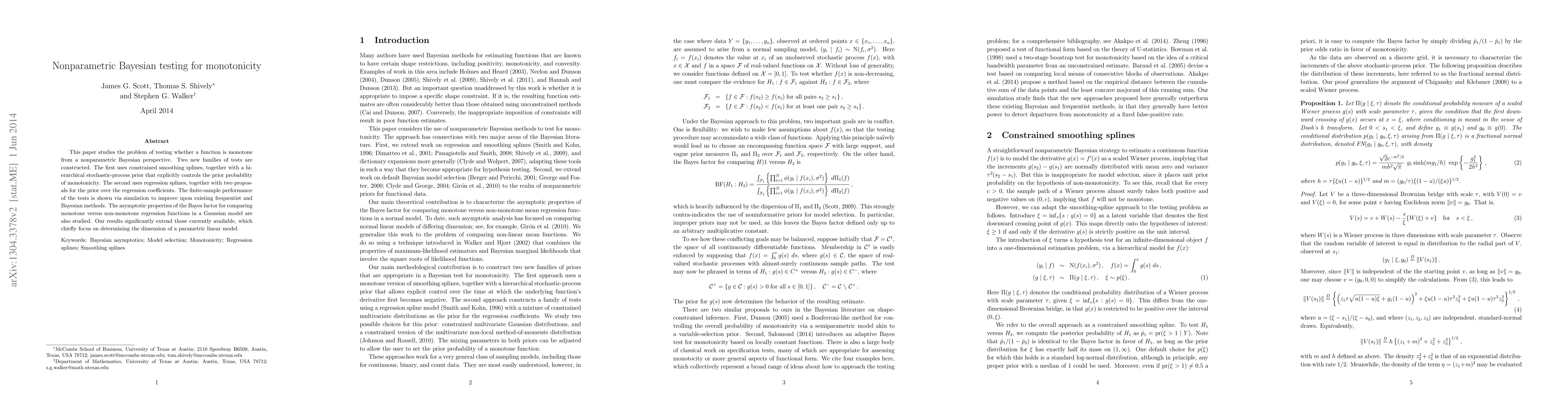 This paper introduces two new nonparametric Bayesian tests for monotonicity using constrained smoothing splines and regression splines, demonstrating superior finite-sample performance over existing methods through simulations. The study also explores the asymptotic properties of the Bayes factor for comparing monotone versus non-monotone regression functions.
