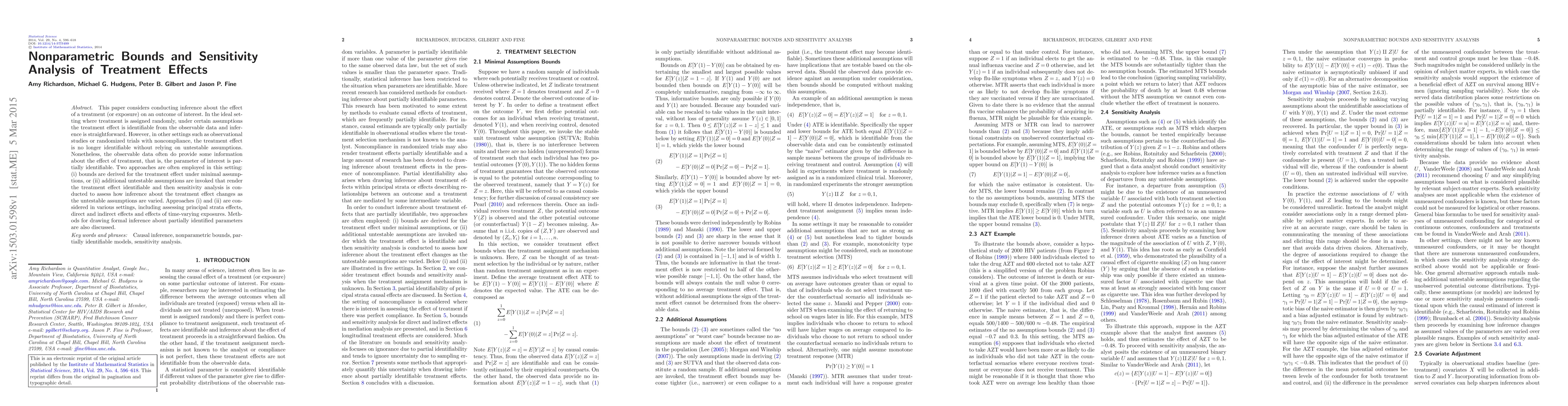 This paper explores the inference about treatment effects in observational studies and noncompliant randomized trials, focusing on deriving bounds for the treatment effect under minimal assumptions and conducting sensitivity analyses to assess the impact of untestable assumptions. Methods for formal inference about partially identified parameters are also discussed.