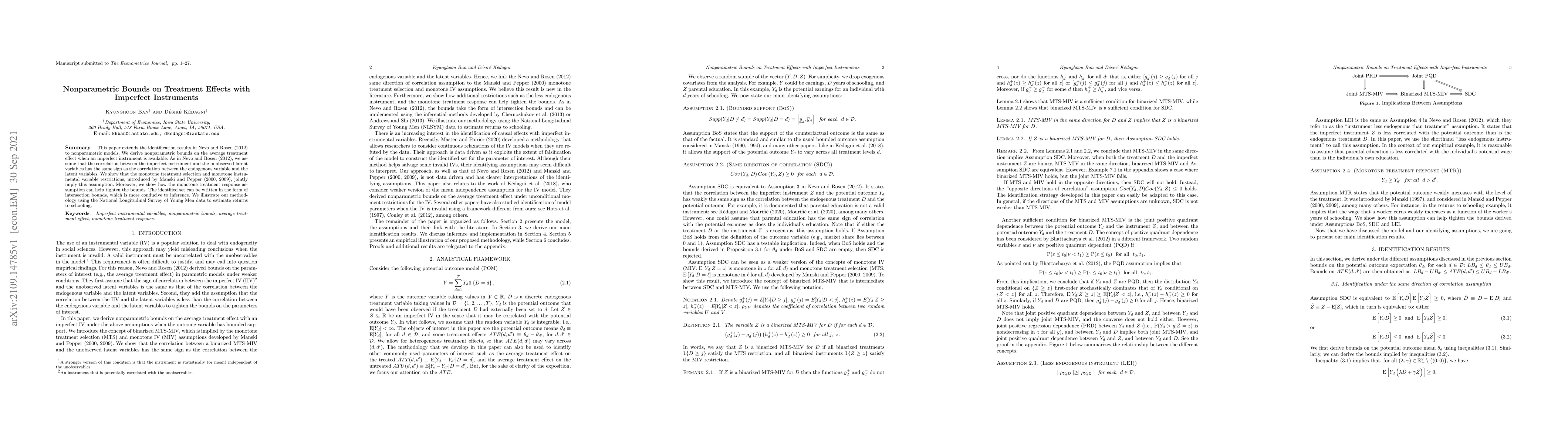 This paper develops nonparametric bounds for estimating average treatment effects using imperfect instruments, extending previous results by Nevo and Rosen (2012). It leverages monotone treatment selection and instrumental variable restrictions to tighten bounds and demonstrates the methodology using data from the National Longitudinal Survey of Young Men to estimate returns to schooling.