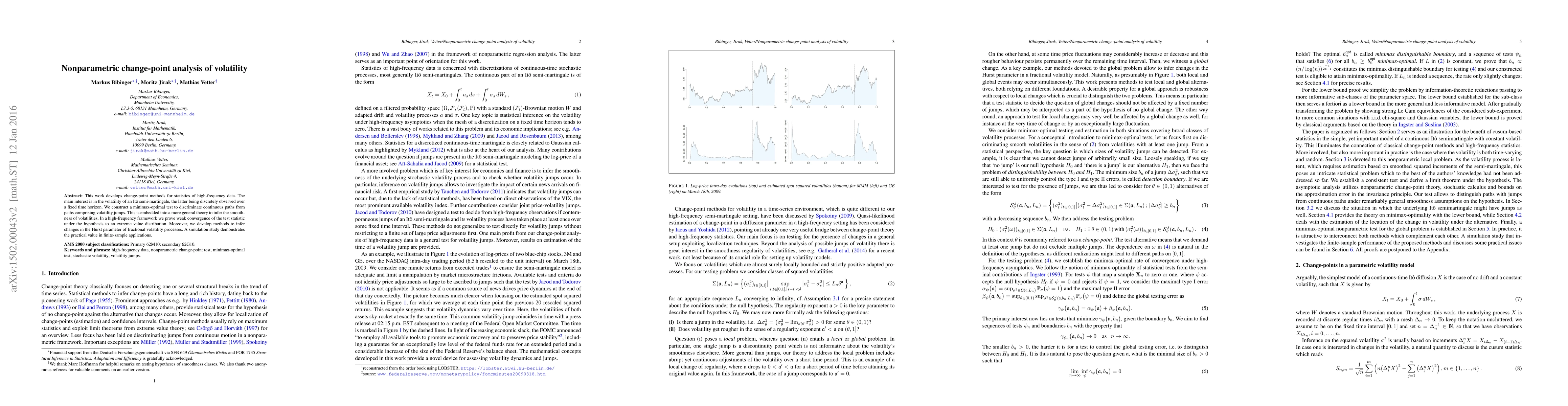 This paper develops nonparametric change-point methods for analyzing volatility in high-frequency data, constructing a minimax-optimal test to detect volatility jumps and changes in the Hurst parameter. Simulation results show practical applicability in real-world scenarios.