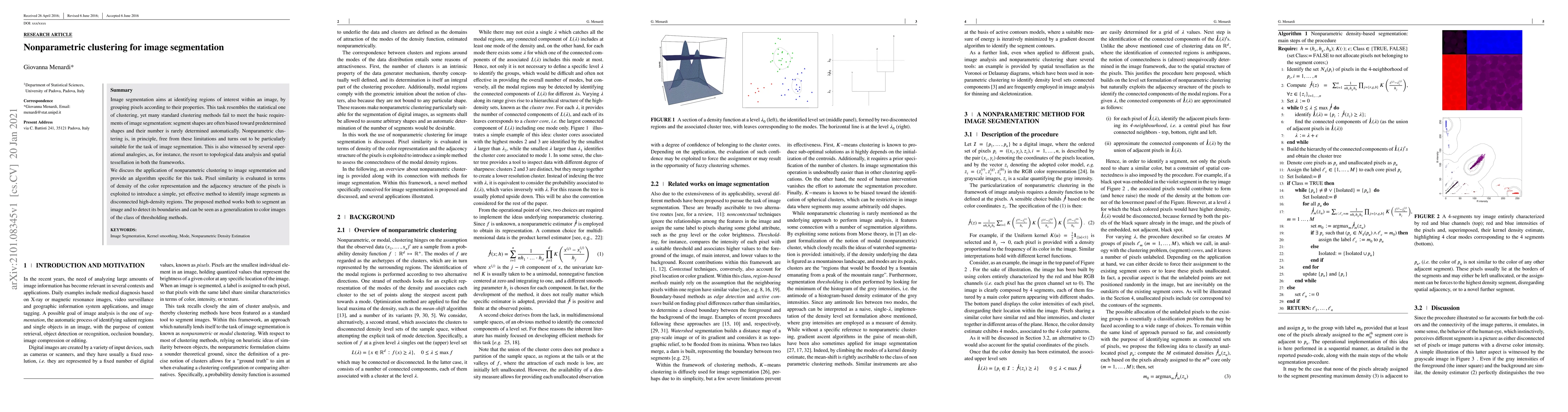 This paper proposes a nonparametric clustering method for image segmentation, leveraging pixel density and adjacency to identify regions of interest without predefined shapes. The method generalizes thresholding techniques to color images and effectively detects both image segments and boundaries.