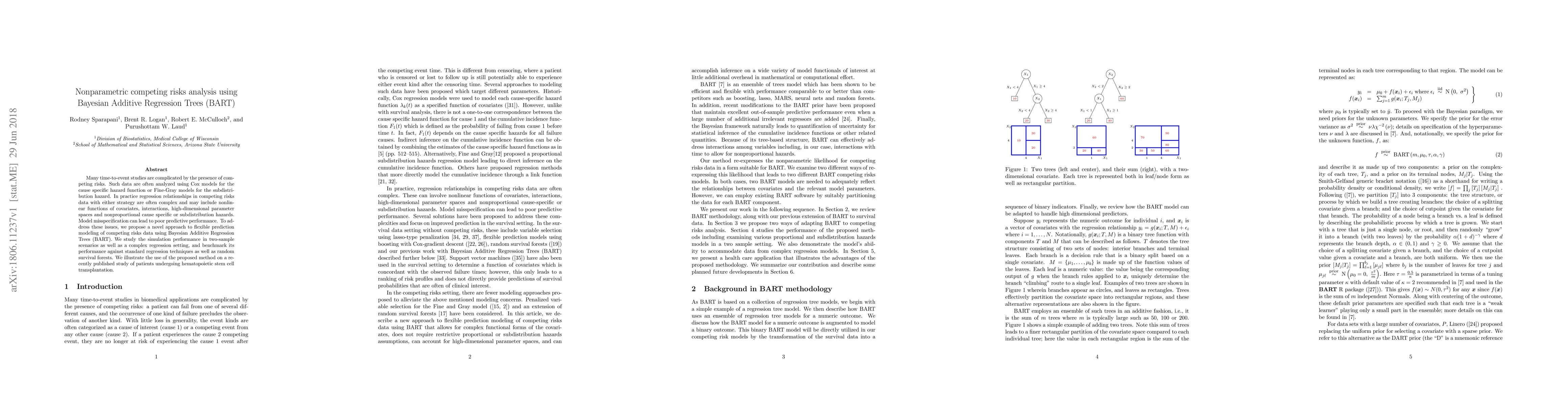 This research introduces Bayesian Additive Regression Trees (BART) for nonparametric competing risks analysis, demonstrating its flexibility in handling complex regression relationships and high-dimensional data, and comparing its performance favorably against standard methods using simulation and real data from hematopoietic stem cell transplantation studies.