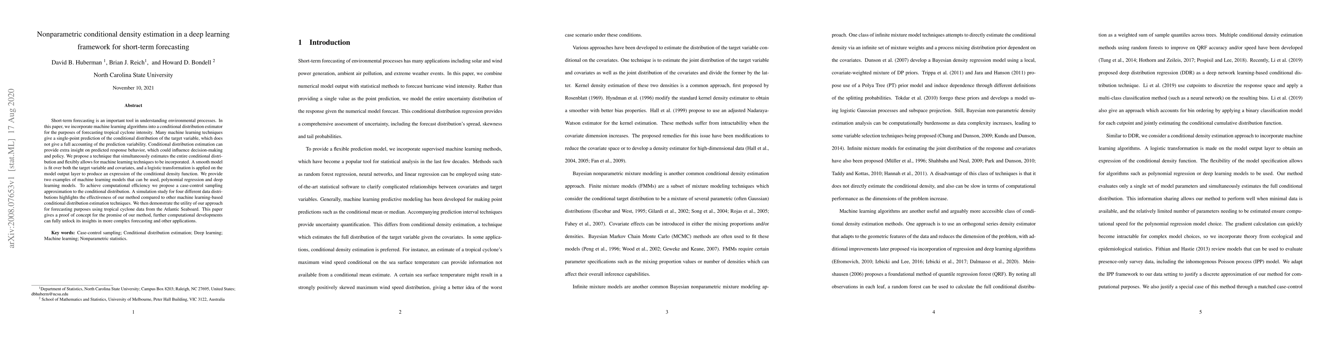 This paper proposes a nonparametric conditional density estimation technique in a deep learning framework for short-term forecasting of tropical cyclone intensity, aiming to provide a full accounting of prediction variability. The method fits a smooth model over target variables and covariates, and uses a logistic transformation to estimate the conditional density function, demonstrating its effectiveness through simulations and real-world cyclone data.