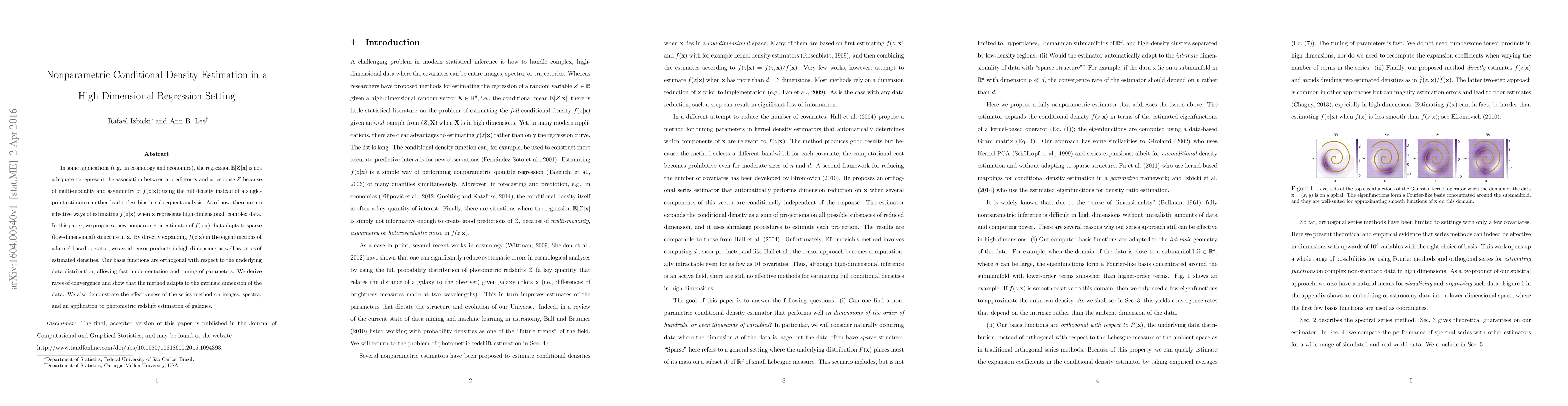 In some applications (e.g., in cosmology and economics), the regression E[Z|x] is not adequate to represent the association between a predictor x and a response Z because of multi-modality and asymmetry of f(z|x); using the full density instead of a single-point estimate can then lead to less bias in subsequent analysis. As of now, there are no effective ways of estimating f(z|x) when x represents high-dimensional, complex data. In this paper, we propose a new nonparametric estimator of f(z|x) that adapts to sparse (low-dimensional) structure in x. By directly expanding f(z|x) in the eigenfunctions of a kernel-based operator, we avoid tensor products in high dimensions as well as ratios of estimated densities. Our basis functions are orthogonal with respect to the underlying data distribution, allowing fast implementation and tuning of parameters. We derive rates of convergence and show that the method adapts to the intrinsic dimension of the data. We also demonstrate the effectiveness of the series method on images, spectra, and an application to photometric redshift estimation of galaxies.
