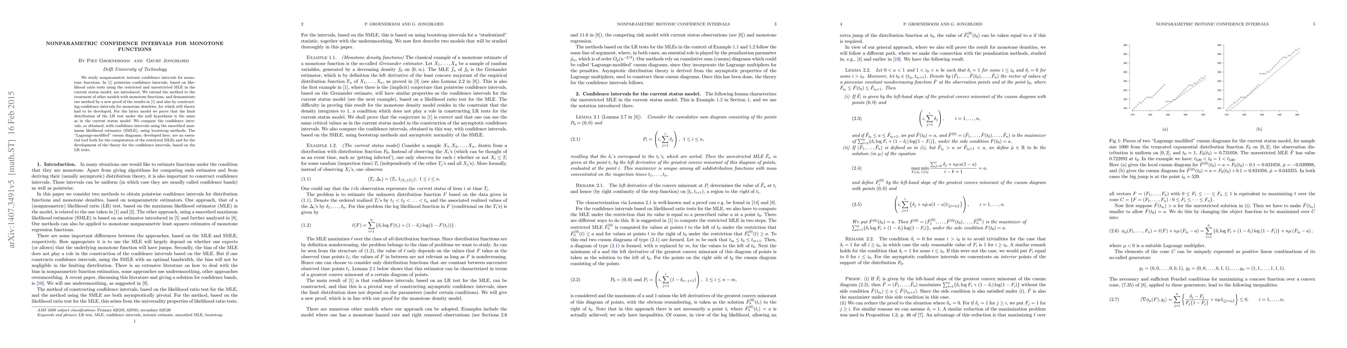 This paper extends nonparametric isotonic confidence interval methods for monotone functions beyond the current status model to other related models, introducing new proofs and confidence intervals for monotone densities. The authors use `Lagrange-modified' cusum diagrams for computing restricted MLEs and developing the theory for LR test-based confidence intervals, comparing these with intervals from the smoothed maximum likelihood estimator.